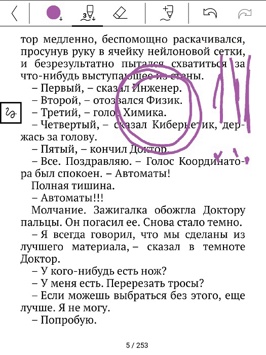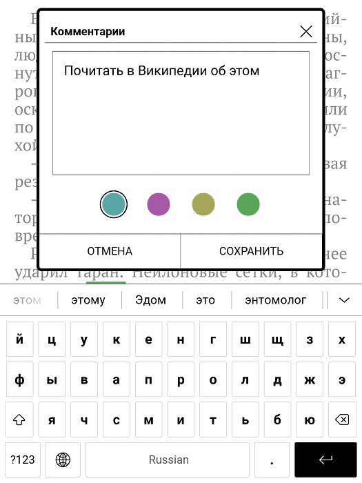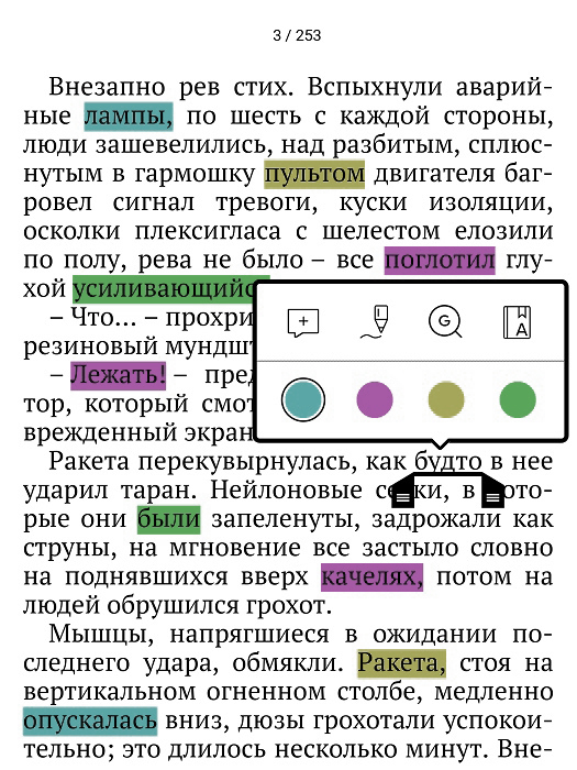 Отдельно отмечу «заметочную» функциональность – в ней активно используются возможности цветного дисплея. Фрагменты текста можно и просто выделять, и добавлять к выделению комментарии. Это удобно: например, все, что связано с одним персонажем книги, выделяем желтым, с другим – розовым. Заметки/комментарии сохраняются в формате HTML в памяти ридера, так что при желании их можно перенести на смартфон или компьютер.