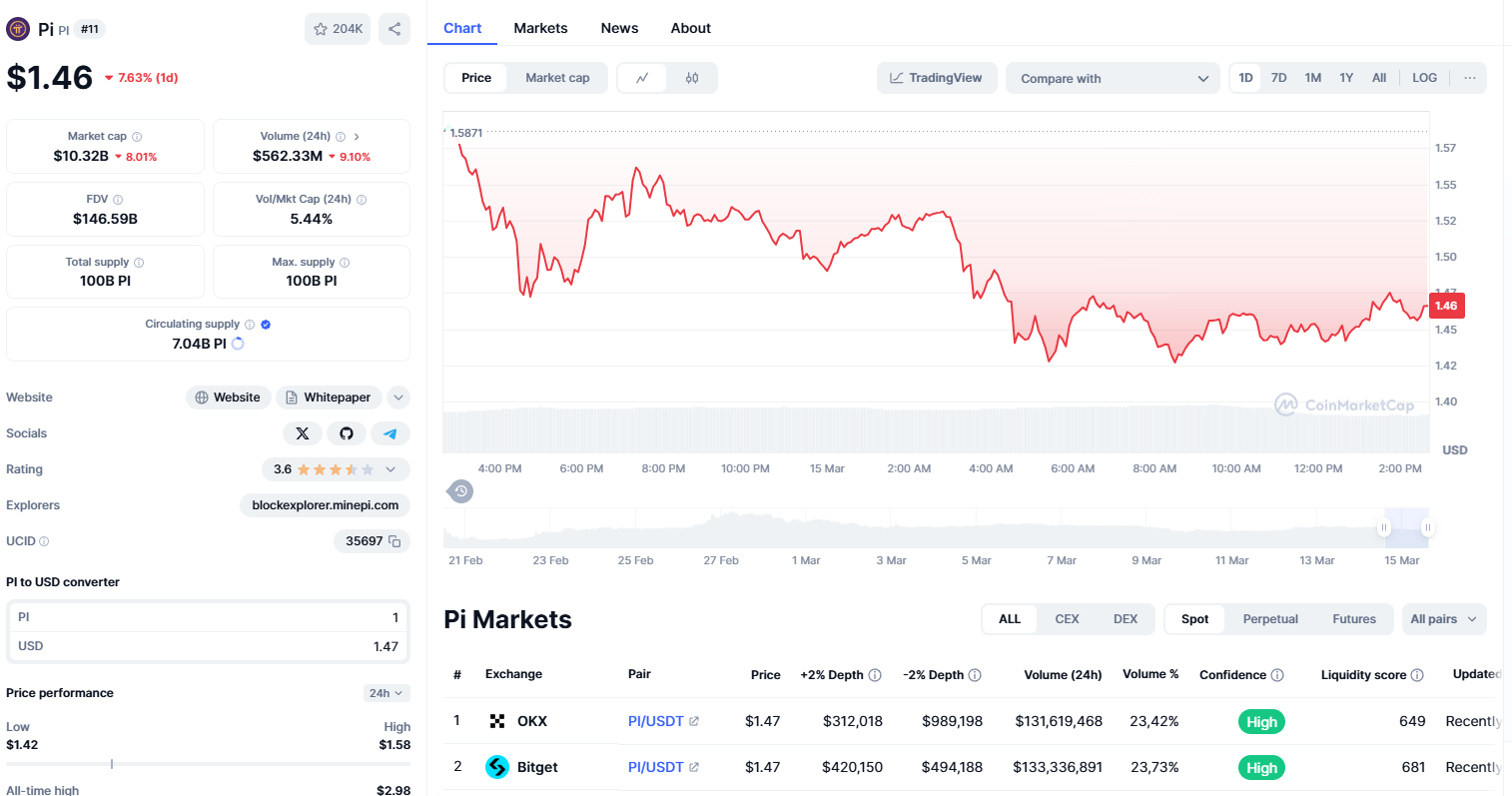 Если мы посмотрим на coinmarketcap, то увидим, что монета торгуется на серьезных, можно сказать топовых биржах. Это OKX, Bitget, MEXC, Gate.io, LBank и др. Кстати скоро обещают и листинг на бирже BingX Она очень лояльна к СНГ аудитории и позволяет торговать без KYC. На торгах монета Pi за 24 часа, если смотреть по топовым биржам, набирается около двух миллиардов. Это серьезный объем. Ниже подготовил для вас небольшой актуальный на данный момент видео обзор проекта PI.