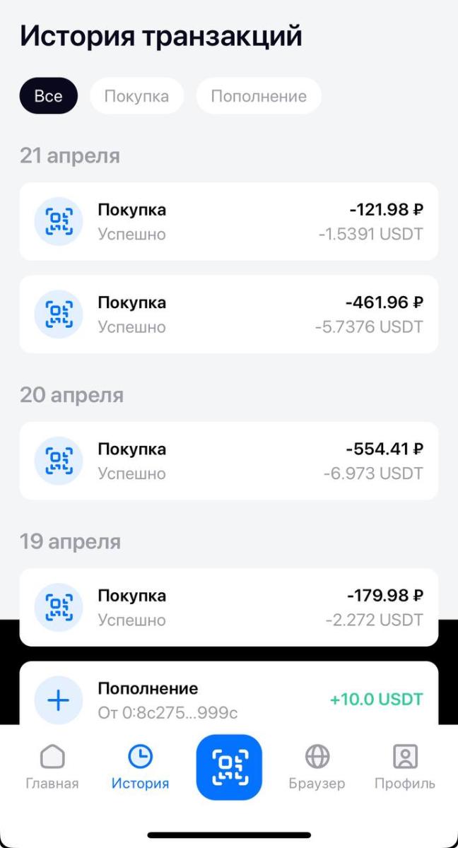 Я лично протестировал сервис и могу сказать, что работает все очень быстро. Оплата проходит в течение 10 - максимум 12 секунд без задержек на стороне мерчанта. Работает приложение везде, где есть терминал с QR-кодом и приемом оплаты по СБП. Приложение в Telegram открывается буквально в пару кликов и вы уже можете оплачивать криптой (USDT, TON и другими) в магазинах, на заправках, ресторанах и других заведениях, сканируя QR-код и подтверждая оплату буквально одним нажатием. Теперь давайте разберём, как это работает и почему это абсолютно законно, а также, почему это не смогут заблокировать как обычные физические и виртуальные криптовалютные карты и другие продукты, которые предлагают биржи и иные сервисы.