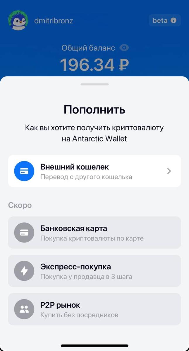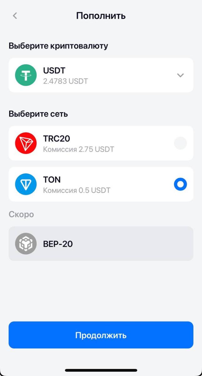 После того как мы попали в интерфейс, нажимаем на кнопку - "плюсик" - пополнить, выбираем внешний перевод, после чего выбираем сеть, в которой будем пополнять USDT. Сервис буквально недавно добавил сеть The Open Network, где комиссия за пополнение всего 0,5 доллара. Ранее для пополнения была доступна только сеть TRC-20 с комиссией 2,75$, что конечно было менее удобным и привлекательным при покупках в магазинах на небольшую сумму. Сейчас же вы можете пополнить кошелёк буквально на два доллара и испытать как это работает, купив жвачку в магазине. Далее обещают добавить возможность оплаты через TON и BTC, а также сеть для пополнения BEP-20, в которой возможно будут ещё более низкие комиссии.
