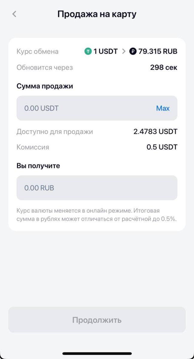 Также данный сервис имеет возможность обмена крипты на рубли с получением рублей на вашу карту. Для этого также пополняем кошелёк, нажимаем на кнопку с изображением банка - "Продать", вводим номер своей карты и подтверждаем сделку. После поступления средств на карту их также необходимо задекларировать как продажу криптовалюты.