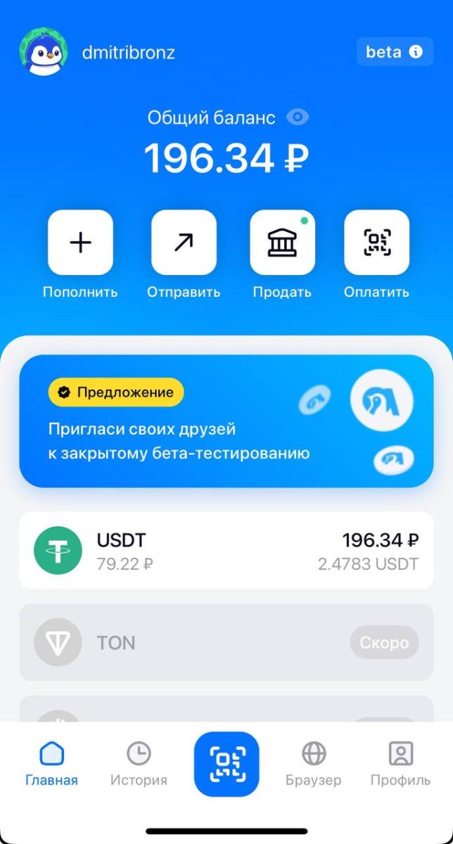 Итак, для того чтобы формально "оплачивать криптой" в магазинах, необходимо просто перейти в Telegram бота по ссылке в начале статьи и активировать его. после чего нас сразу же перекинет в miniApp приложение в Telegram. Очень радует бесшовная регистрация, то есть нам не нужно вводить свои данные, регистрировать телефон или почту. Всё делается буквально в два клика, после чего мы попадаем в мини приложение в Telegram с интерфейсом кошелька для пополнения крипты и оплаты ей в любых магазинах через QR-код. Я уже платил за покупки в "Пятёрочке", "Ленте" и других магазинах; это действительно не вызывает никаких трудностей и занимает всего 10 секунд.