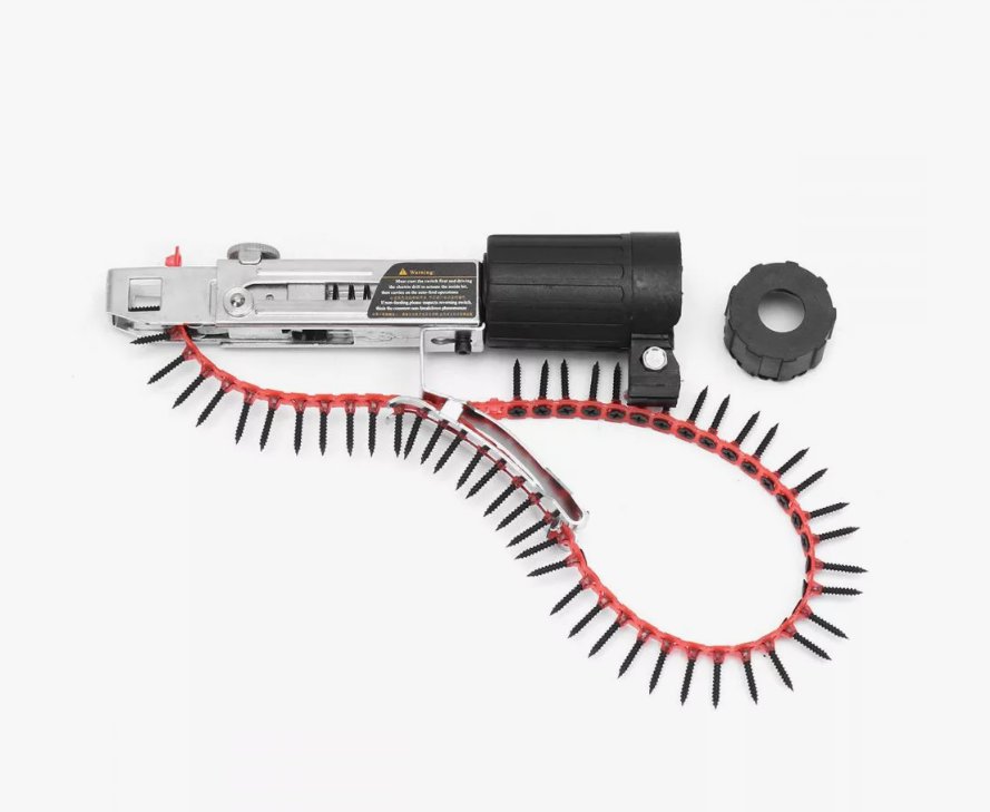 Принцип: насадка крепится к шуруповерту, в нее вставляется специальная лента с шурупами (покупается отдельно, бывает разного калибра и длины шурупов). Лента вмещает до 50 крепежей! Двигатель шуруповерта приводит в действие механизм подачи и закрутки. Вам остается: только позиционировать инструмент и нажимать на курок. Скорость сборки взлетает в разы! Особенно незаменима при больших объемах: сборка мебели, монтаж ГКЛ, обрешетки, заборов.