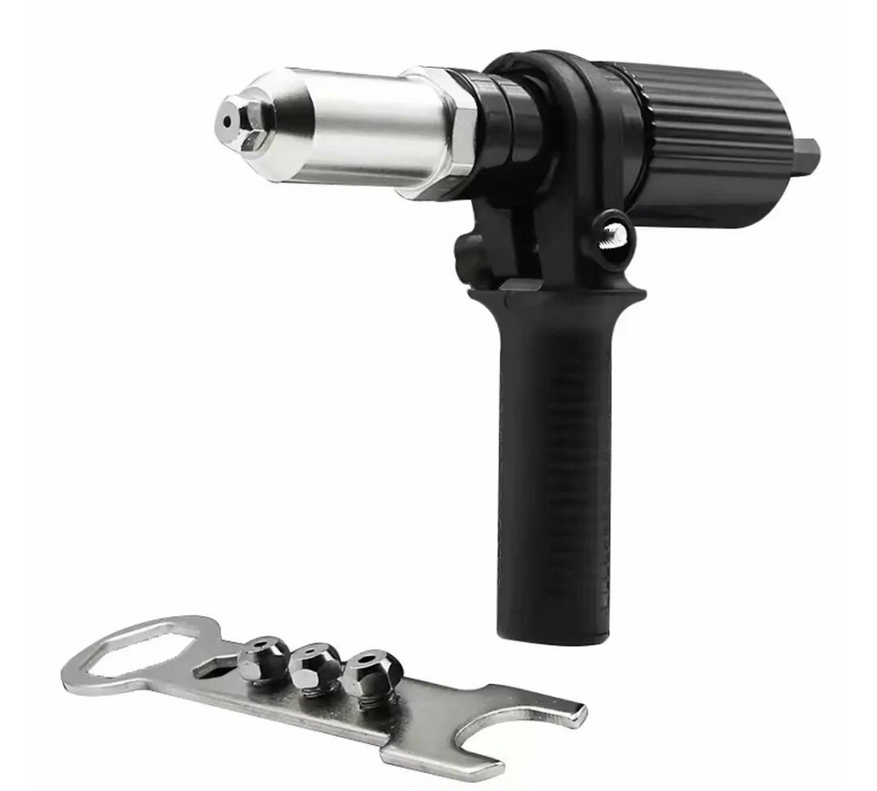 Крепится к дрели/шуруповерту. Вы вставляете заклепку в отверстие, подносите насадку, включаете инструмент – и механизм сам аккуратно формирует замыкающую головку с обратной стороны. Работает с заклепками разного диаметра (обычно от 2.4 до 4.8 мм – самый ходовой диапазон для домашних и гаражных дел).