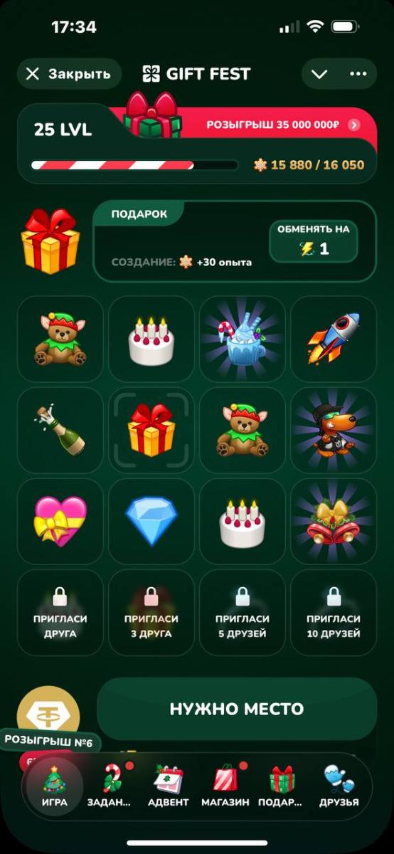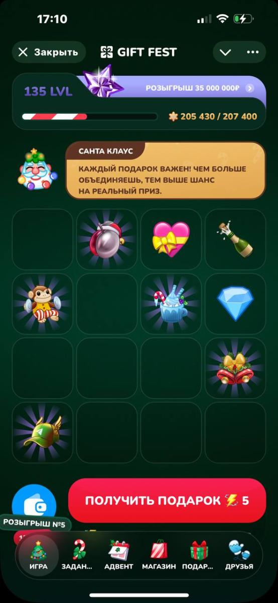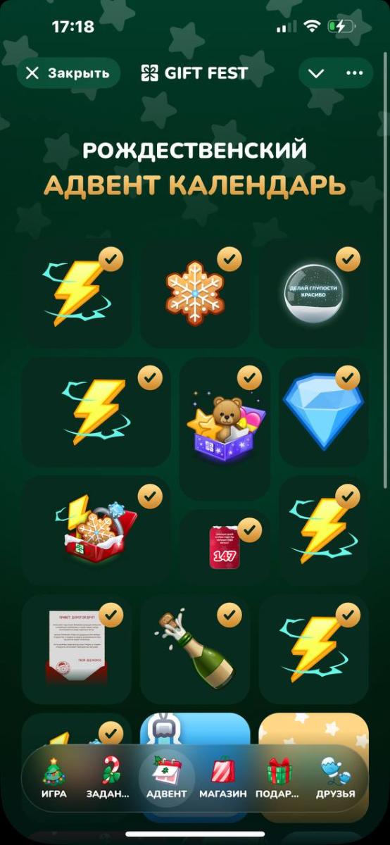 4. Каждый день в разделе «Адвент» открываем новое окошко календаря и забираем сюрпризы – энергию, бустеры или даже прямой доступ к розыгрышам. В разделе магазин можно покупать гифтбоксы с редкими подарками для скрещивания, но лучше не тратиться и играть бесплатно. В этом разделе также есть бесплатные гифтбоксы, которые выдают раз в сутки. В них выпадает энергия и подарки для скрещивания.