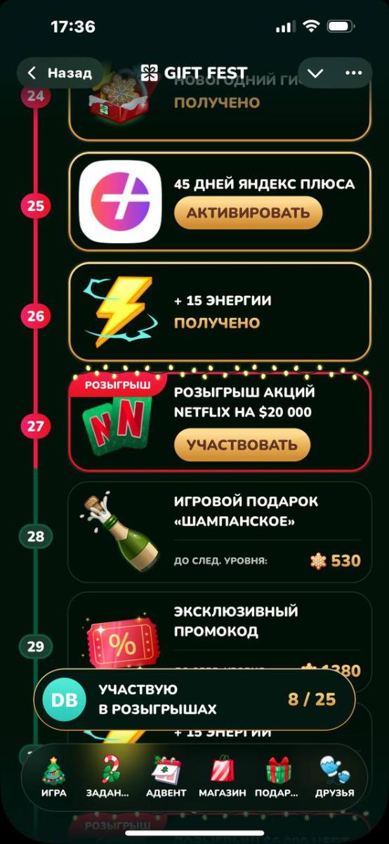 Также есть вероятность, что после завершения предновогоднего ивента в игре активные участники могут рассчитывать на дополнительный дроп. Возможно, это будет эйрдроп токена Telegram Wallet или другие привилегии в развивающейся экосистеме TON. Конечно, это не гарантия, но, по моему опыту, такой сценарий вполне вероятен.