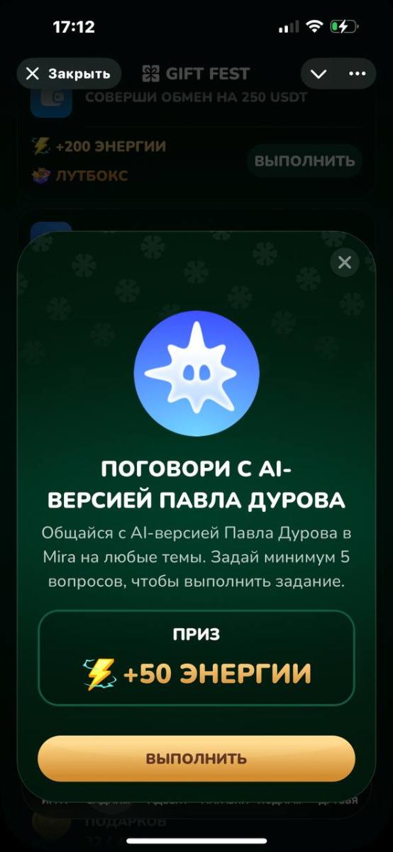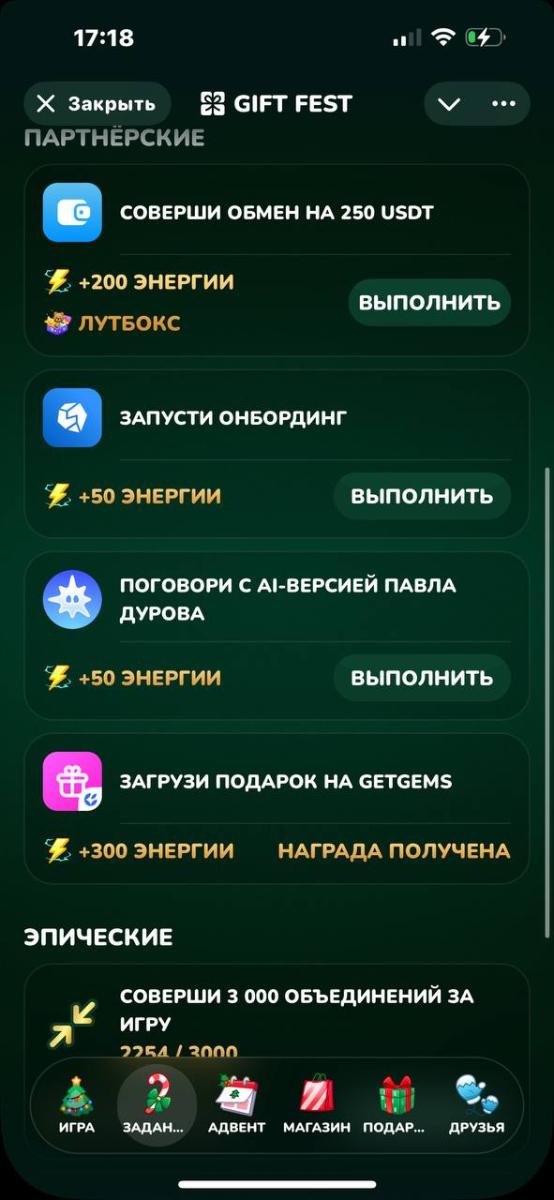 3. В разделе «Задания» ежедневно выполняем простые действия (социальные взаимодействия, прогресс в игре и другие), за что получаем дополнительные порции энергии. Например, за выполнение заданий с Кошельком можно получить больше всего энергии. Также появилось задание по взаимодействию с нейронкой Дурова Mira, но работает оно пока так себе.