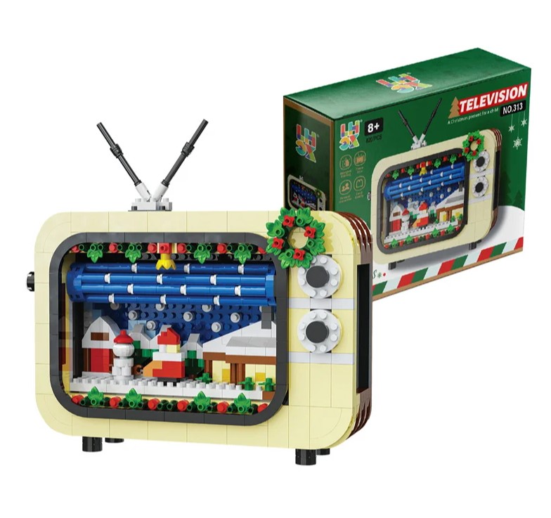 Необычный выбор для тех, кому близка ностальгия. Конструктор собирается в виде старого телевизора, в котором новогодний сюжет становится частью композиции. Внешний вид отсылает к эпохе массивных корпусов и механических переключателей, что создаёт сильный визуальный контраст с праздничной тематикой.