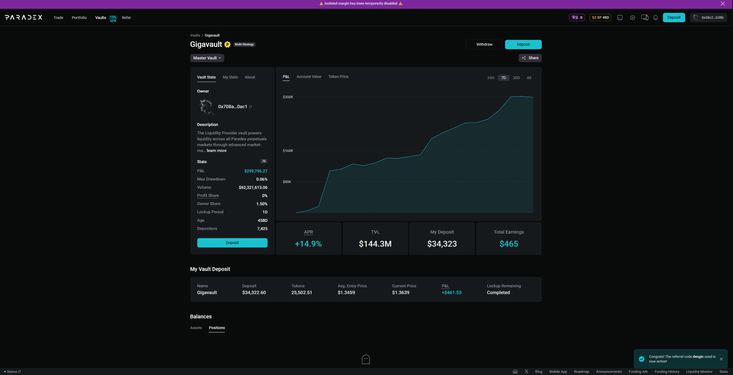 При этом доходность здесь никогда не идёт по прямой линии. Бывают периоды, когда PnL пула уходит в минус, иногда очень существенно. Например, недавно был момент, когда в Paradex PnL показывал минус полмиллиона долларов - это значит, что трейдеры в тот период заработали, и выплаты пошли из пула. Это абсолютно нормальная ситуация. Точно так же работают и централизованные биржи. Разница лишь в том, что здесь всё прозрачно и реализовано через DeFi. На дистанции такие периоды перекрываются сериями ликвидаций и комиссий, и кривая снова ползёт вверх.
