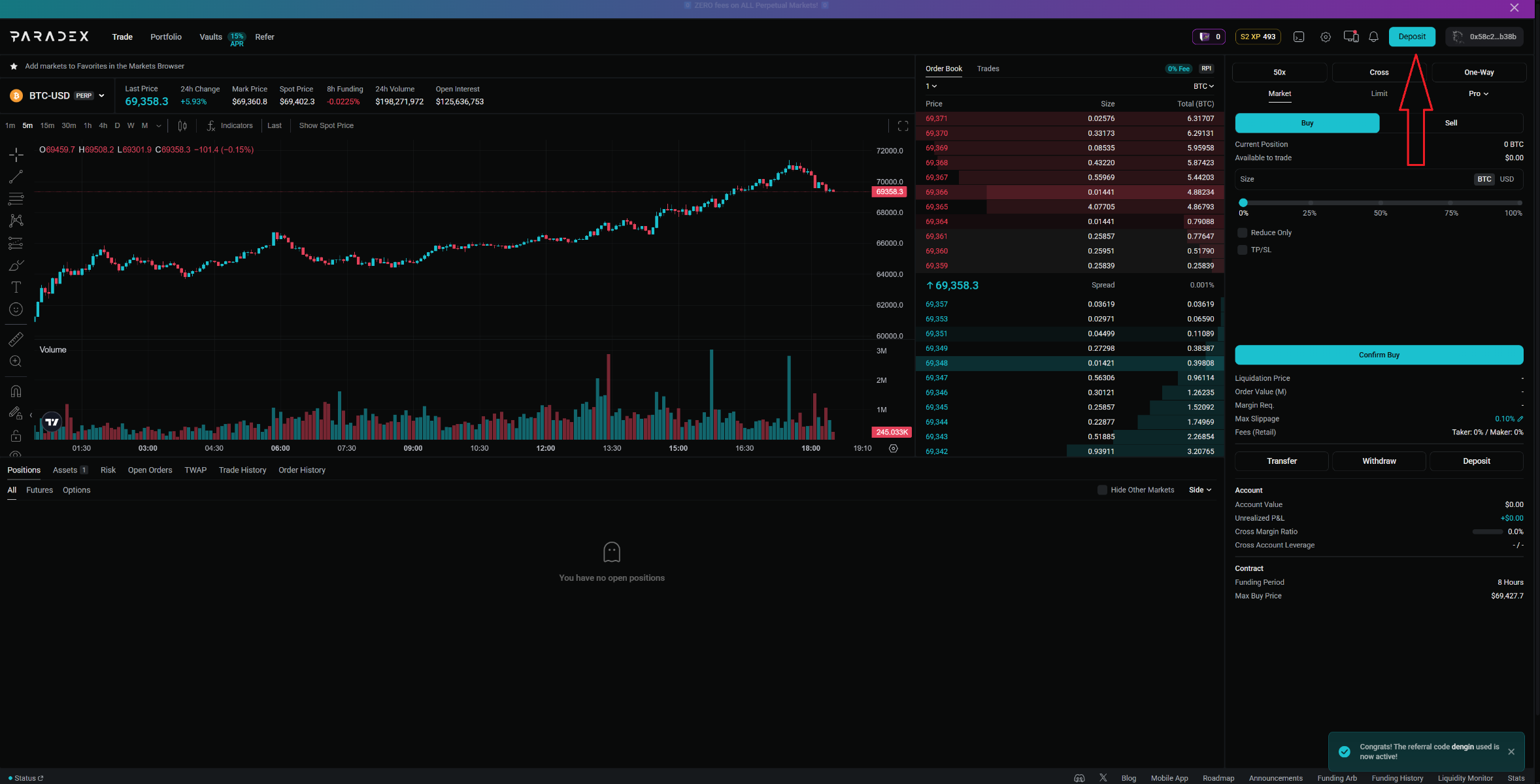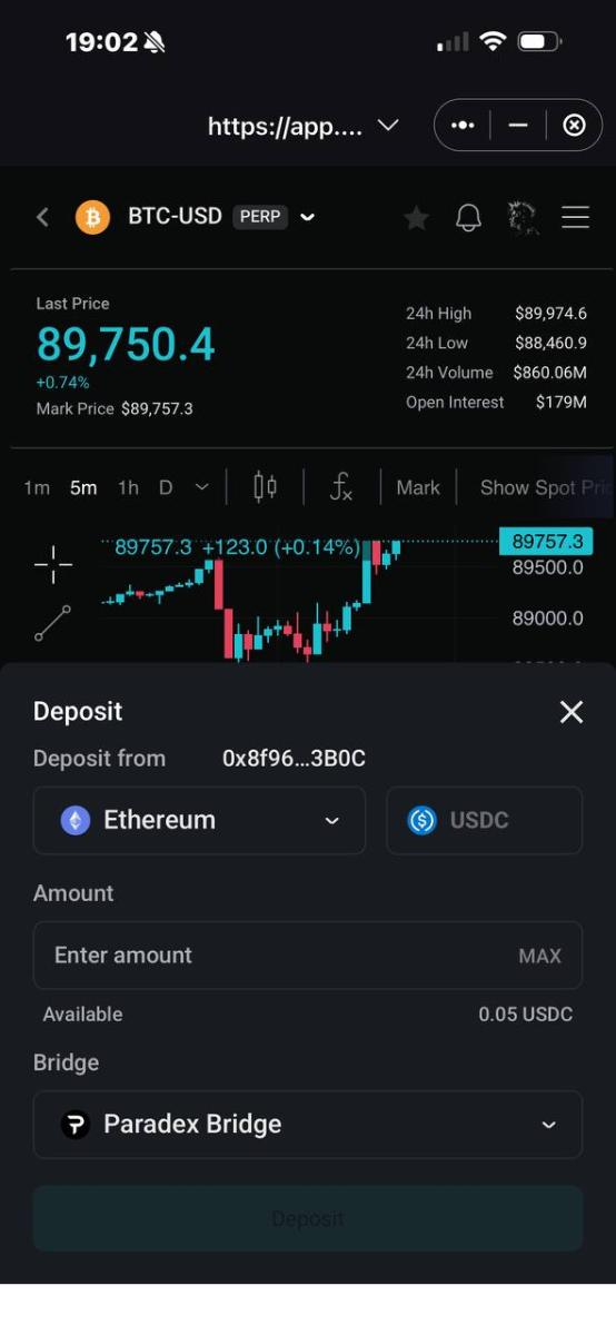 Далее нужно перейти в сам протокол (в данном случае - Paradex) и подключить свой кошелёк в правом верхнем углу страницы. После подключения там же нажимаем "Deposit", вводим сумму и подписываем транзакцию. Самое интересное, что делать этом можно со смартфона и просто используя свою Seed-фразу распоряжаться средствами из любой точки мира.