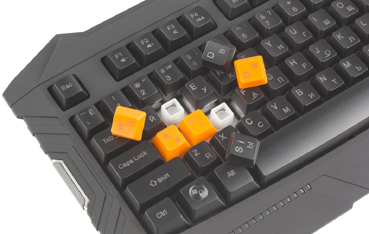 Индикаторы, находящиеся на клавиатуре прикрыты за тонированным стеклом, в связи с этим свечение получается неярким и довольно мягким. Клавиатура комплектуется сменами клавишами “WASD” и стрелками оранжевого цвета в количестве 8 штук. Длина кабеля составляет 1,8 м, что вполне хватит для подключения клавиатуры к удаленным портам USB компьютера.Раскладка у клавиатуры SVEN Challenge 9100 стандартная, клавиши крупные, кнопки имеют покрытие Soft-touch. Клавиатура имеет длинный ход клавиш, что весьма необычно для клавиатуры игрового класса. При нажатии на клавишу можно различить четкий и громкий клик.