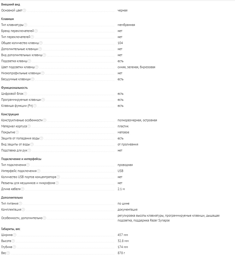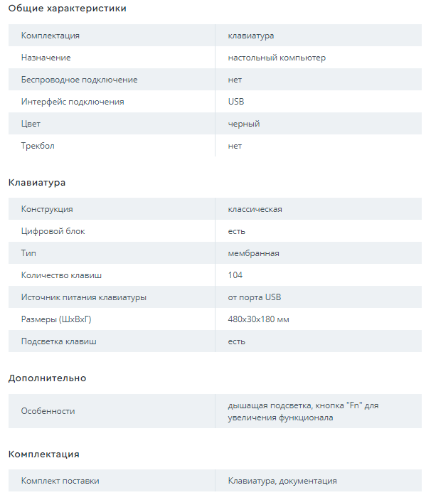 Для начала ознакомимся с техническими характеристиками клавиатуры: