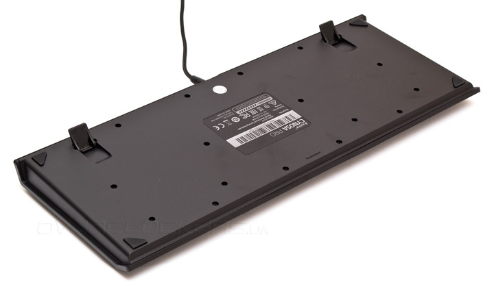 Возможно увеличить наклон угла клавиатуры при помощи раскладных ножек, что позволит приблизительно приподнять клавиатуру на 10 мм.Нижняя часть корпуса плоская, для устойчивости на клавиатуре нанесены резиновые ножки по углам, что позволяет отлично удерживать клавиатуру на поверхности. На задней стороне корпуса находится наклейка с серийным номером девайса. Также на задней стороне расположены 12 отверстий, для крепежных винтов, также имеются четыре отверстия во втором ряду снизу служащие в случае если жидкость попадет в клавиатуру (водостоки).