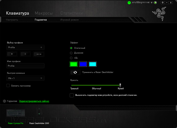 Клавиатура в качестве ПО использует Razer Synapse 2.0. На главном экране настройки возможно перенастроить все 104 клавиши, которая использует клавиатура, в случае возврата к старым настройкам предусмотрены разделенные профили для удобной конфигурации устройства.Клавиатура настраивается на 3 варианта: для яркости и световых эффектов, а также для выбора цвета с возможностью полного отключения подсветки.