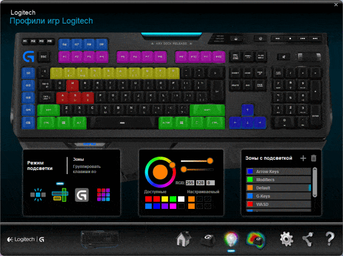 Программное обеспечение для клавиатуры Logitech стандартно, отвечает за это программа Logitech Gaming Software. Программа имеет широкий функционал в которой пользователь имеет возможность изменять назначение дополнительных клавиш, изменять подсветку, анимацию цвет и т.д.