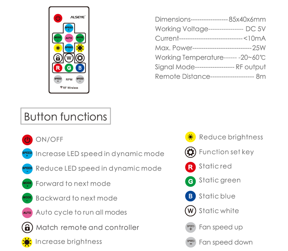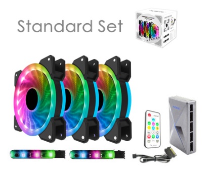 В стандартный набор вентиляторов ALSEYE RGB входят: три вентилятора с RGB подсветкой, контроллер управления скоростью вращения, кабель для контроллера, дистанционный пульт управления, а также две RGB полоски для подсветки корпуса.