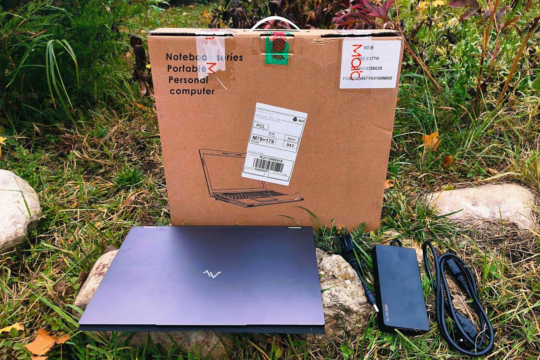 Устройство приехало в транспортировочной коробке с непривычным соотношением сторон – ширина меньше высоты. Для удобной переноски у нее имеется пластиковая ручка. Внутри ноутбук обернут в целлофан и надежно зафиксирован во вставках из вспененного полиэтилена. В комплекте также идет составная зарядка (20 В, 1,4 А) с толстыми, но довольно гибкими проводами общей длиной 2,8 м, а также салфетка, проложенная между экраном и клавиатурой.