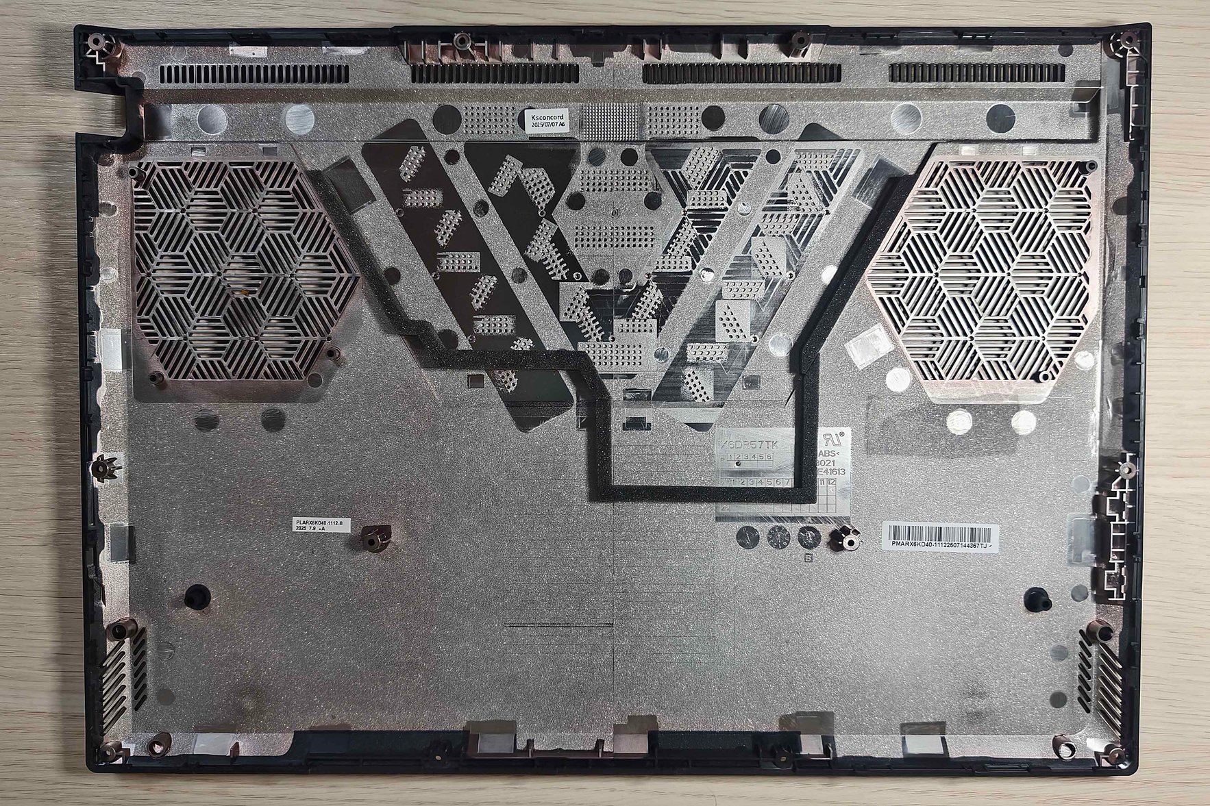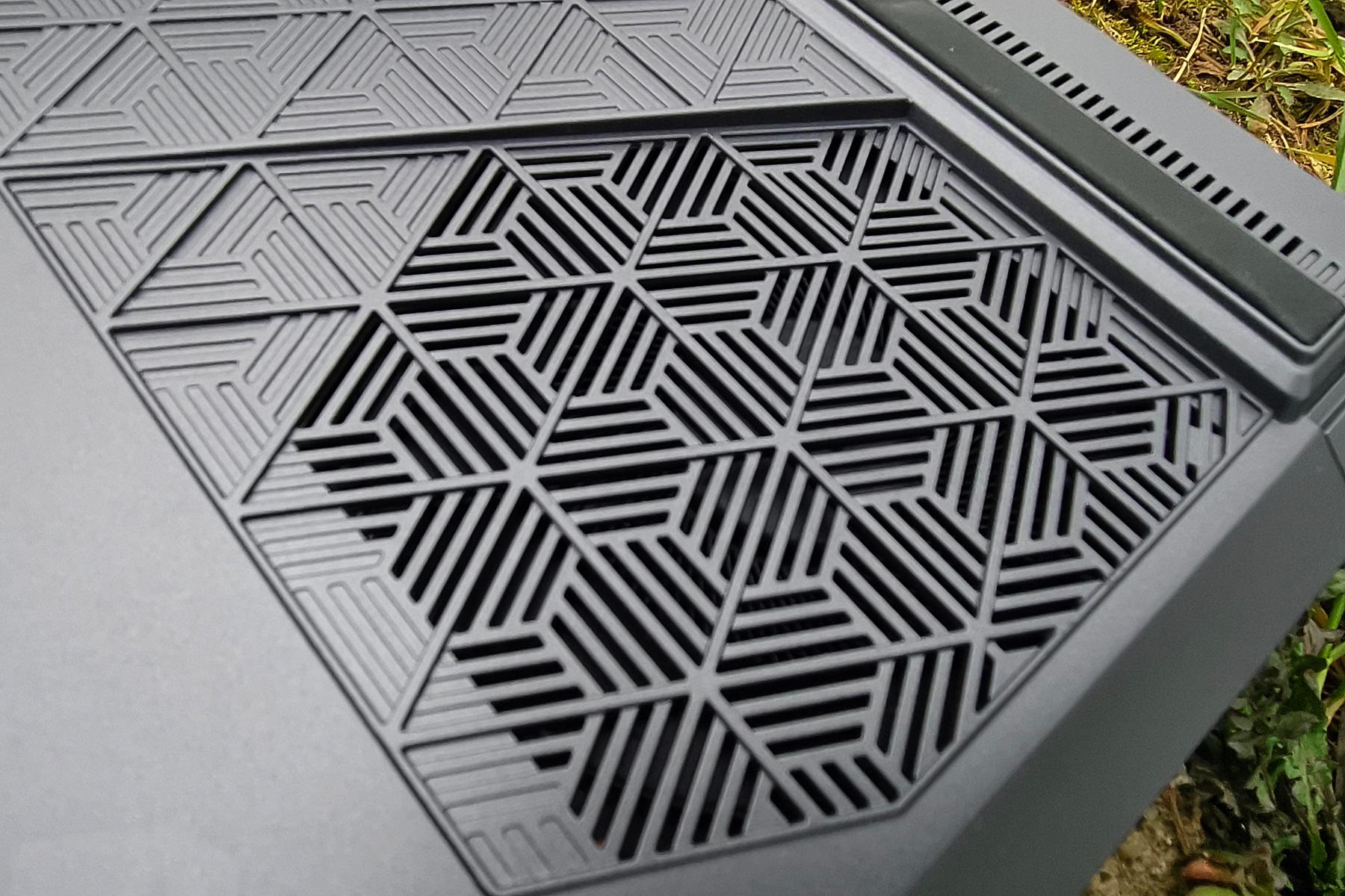 Нижняя панель закреплена винтами. Примерно половину ее занимает геометрический рисунок, плавно переходящий в две большие вентиляционные решетки, под которыми установлено по кулеру. Выходит же теплый воздух через радиаторы сзади ноутбука.