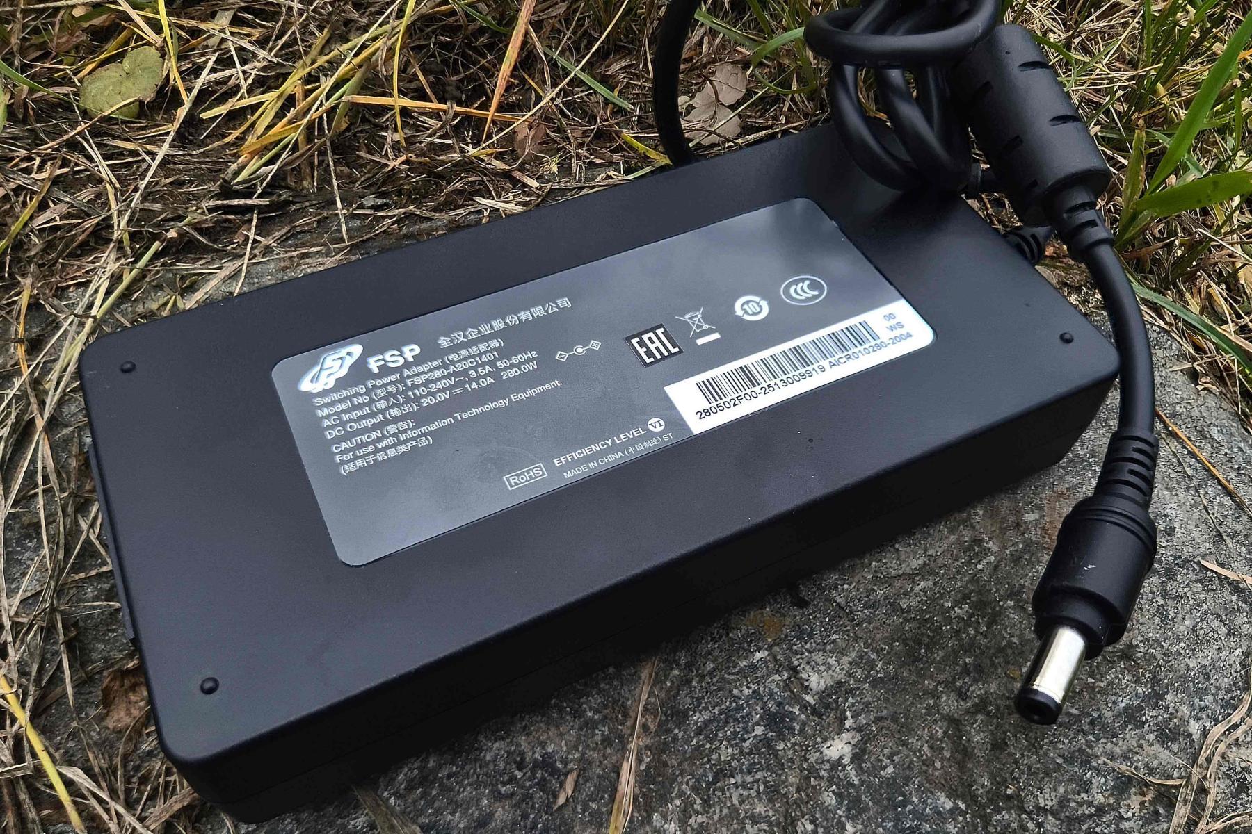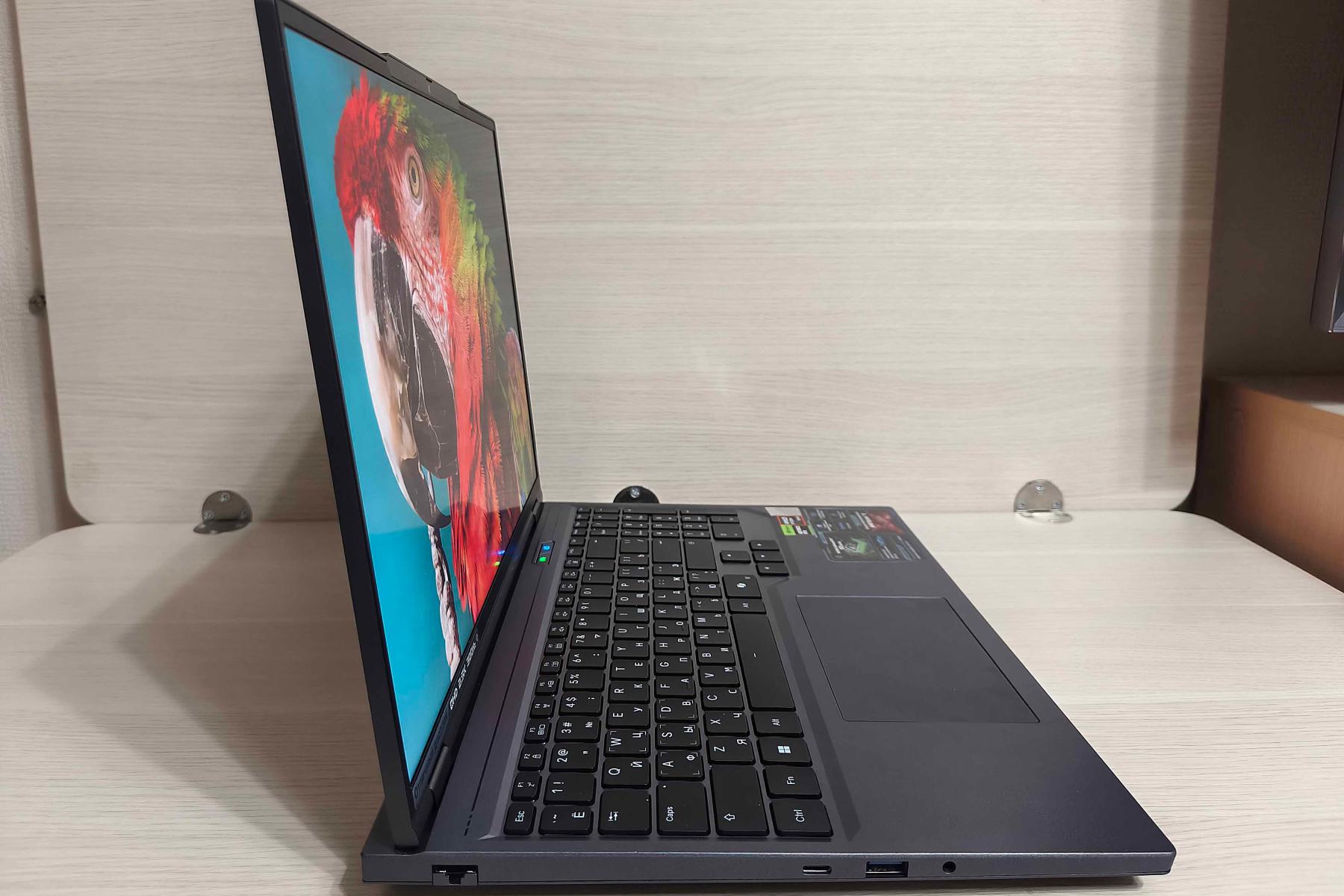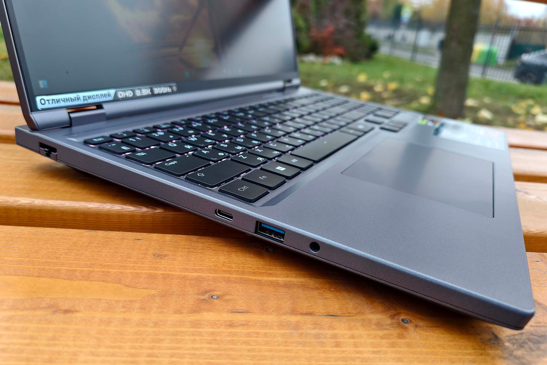 Typhoon X16F комплектуется блоком питания мощностью 280 Вт (20 В, 14 А) с 5,5-мм цилиндрическим коннектором. Для зарядки до 50% ему требуется 35 минут, а до 100% – 80 минут. При этом заряжать компьютер можно и через порты USB Type-C – тыльный поддерживает PD до 140 Вт, правый – PD до 100 Вт. Конечно, процесс будет идти значительно медленнее. Если кабель не подключен или аккумулятор полностью заряжен, то индикатор на кнопке питания горит голубым цветом, а если идет зарядка или батарея скоро «выдохнется» – оранжевым.