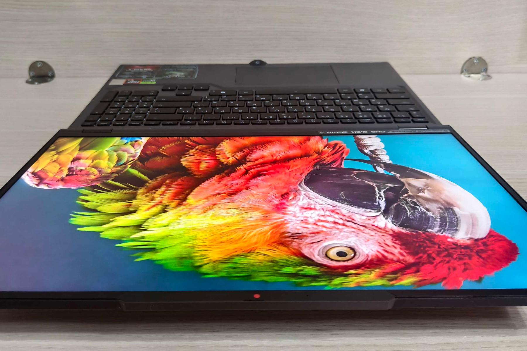 Одно из главных достоинств – большой и яркий скоростной дисплей повышенного разрешения, который выдает красочную, четкую и плавную картинку, а матовое покрытие нейтрализует блики. Крышку можно открыть на 180°, что весьма удобно в некоторых сценариях использования, а перевернуть изображение можно одной кнопкой. Клавиатура имеет удобную раскладку с цифровым блоком и вынесенными «стрелками», а также RGB-подсветку символов.