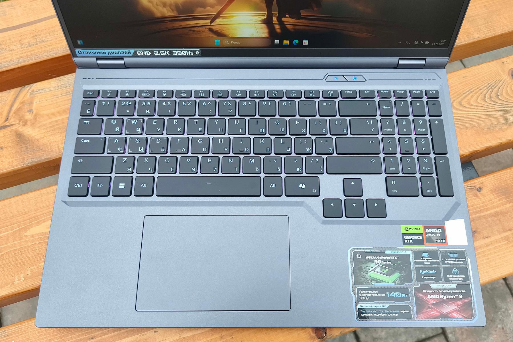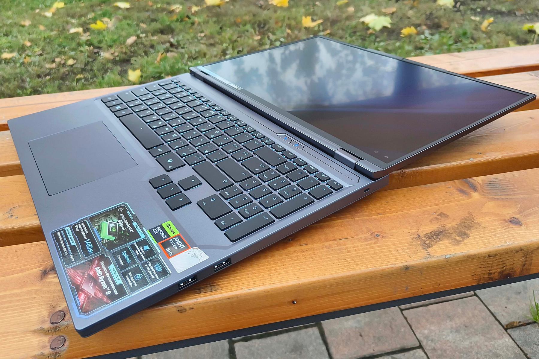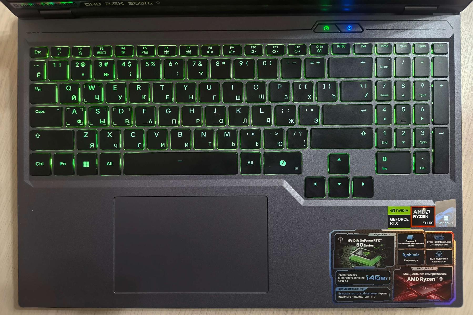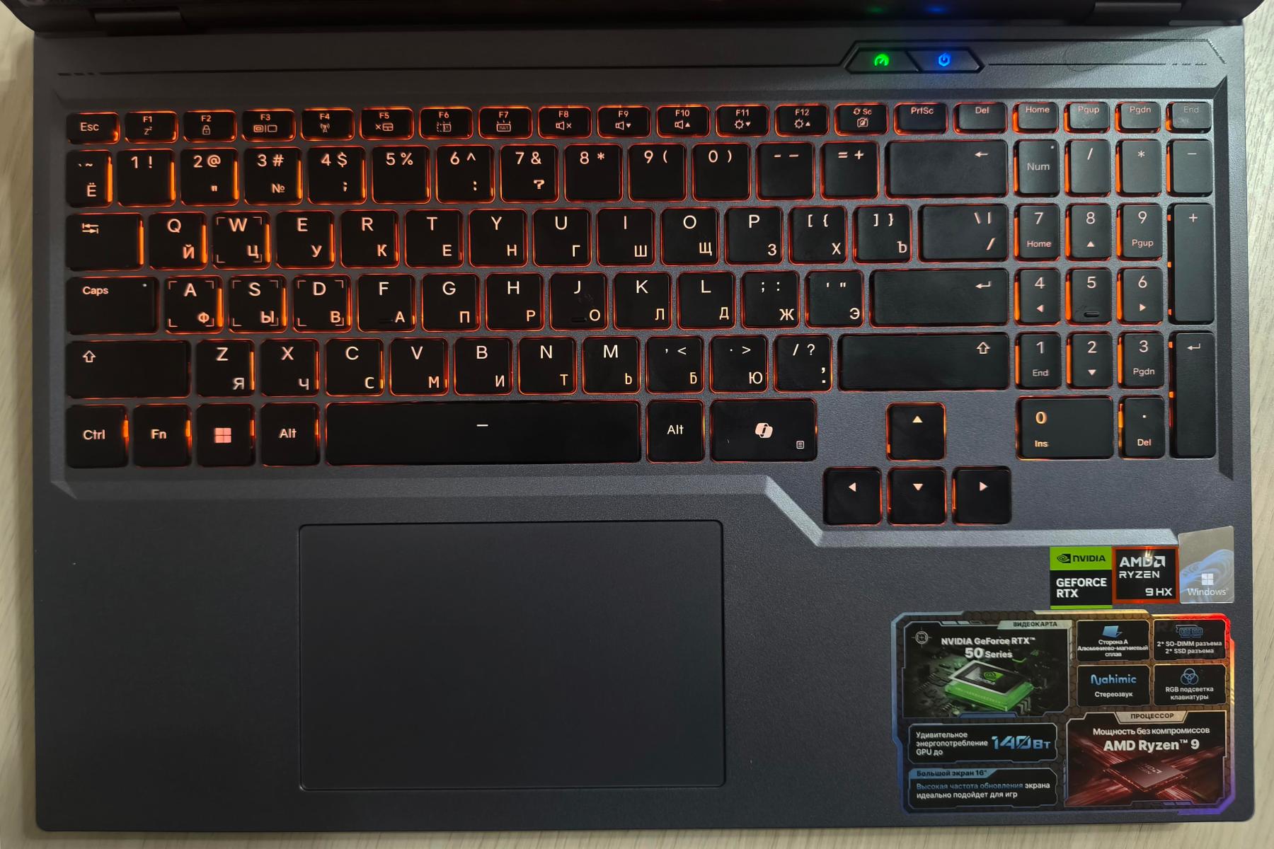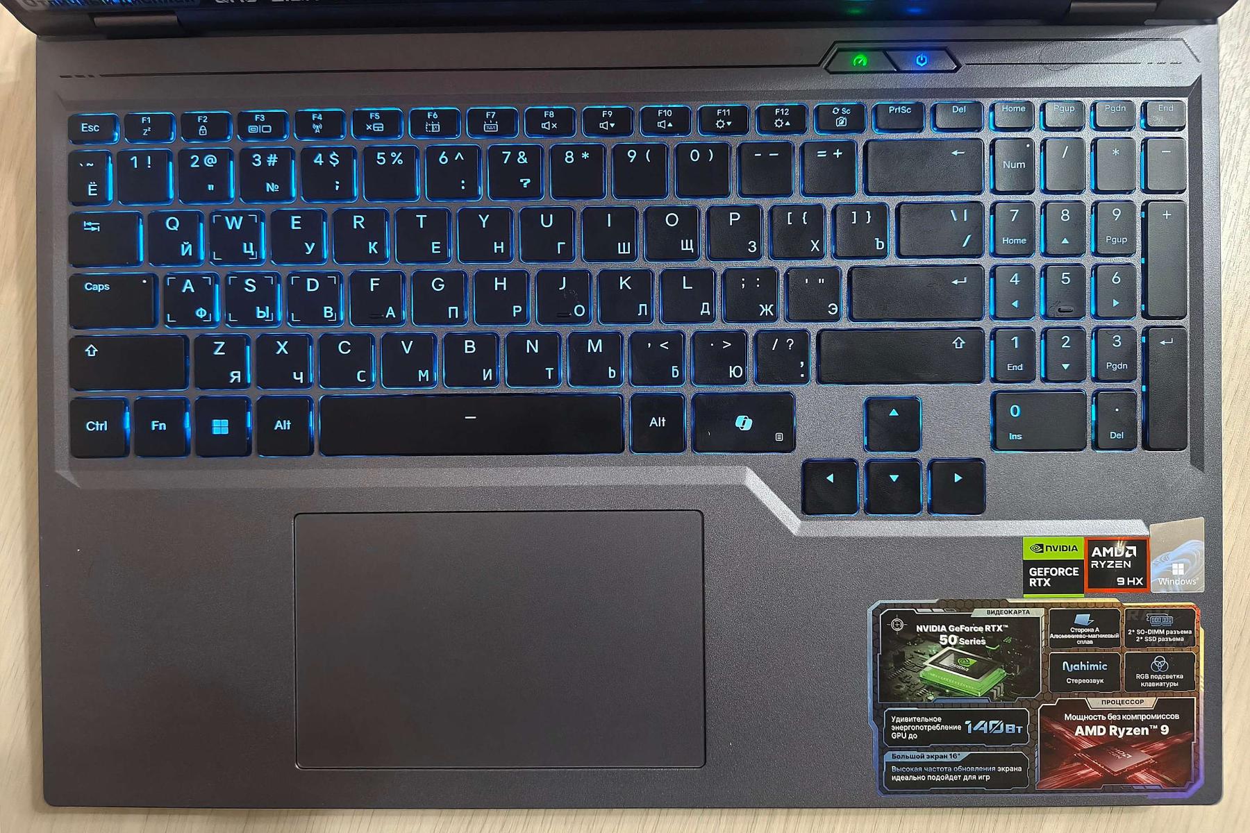 Рамки вокруг дисплея минимальны: верхняя – 7 мм, нижняя – 9 мм, боковые – по 5 мм. Экран и клавиатура слегка утоплены, чтобы не соприкасаться при закрытии. Клавиши включения и переключения режимов снабжены цветовыми индикаторами и вынесены ближе к дисплею, так что риск ошибочного нажатия минимален. Клавиатура имеет настраиваемую RGB-подсветку символов, но единовременно цвет может быть только один. Крупный (123x77 мм) тачпад установлен практически вровень с поверхностью и немного смещен влево. Правый угол украшен россыпью информационных наклеек.