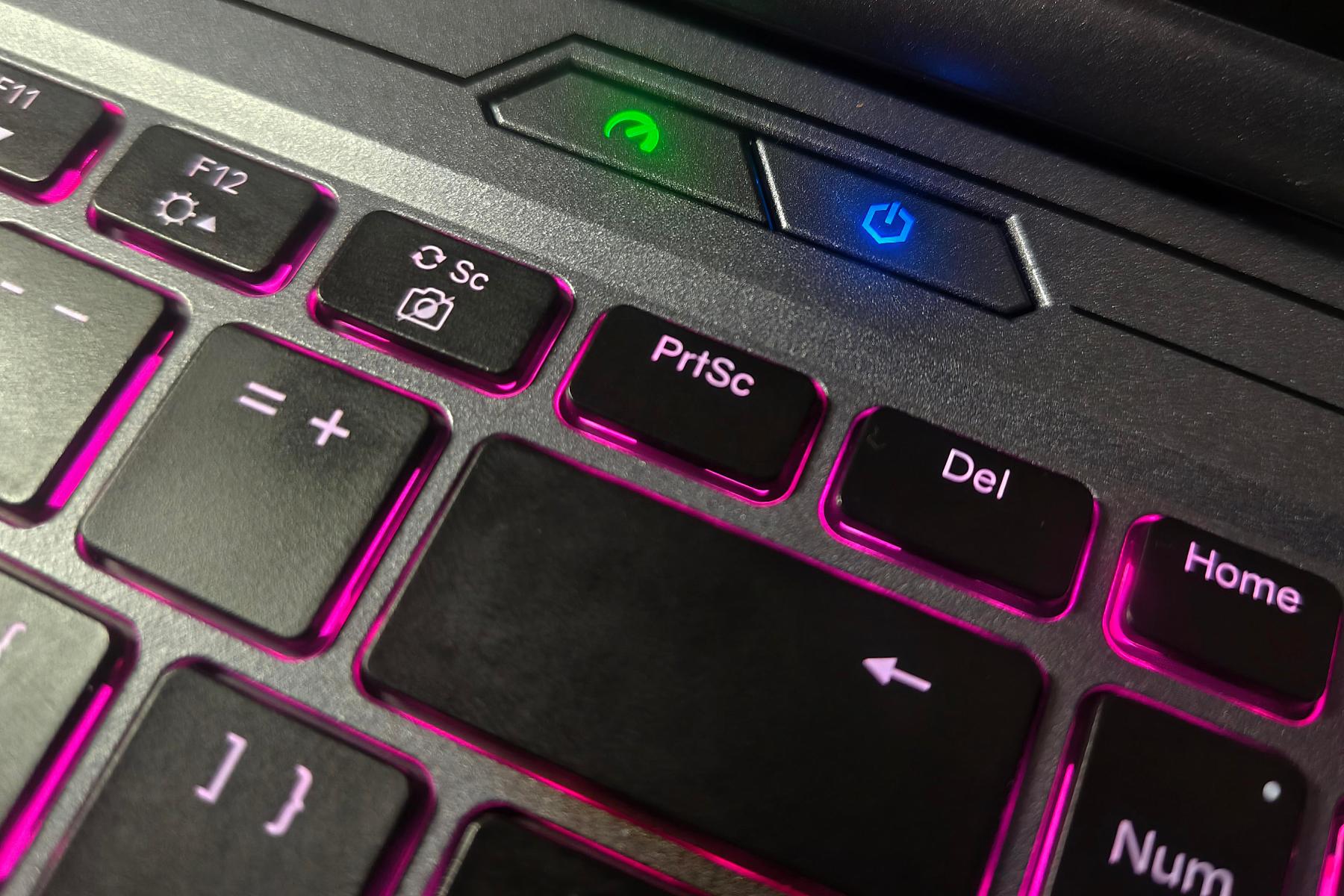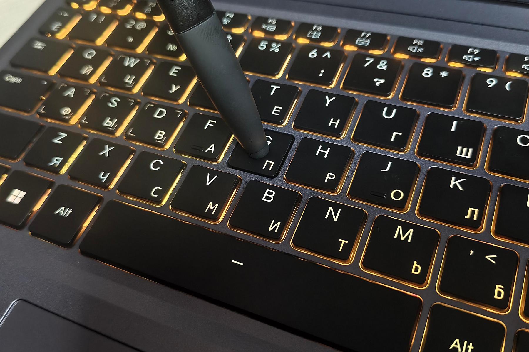 Конструкция мембранная, ход клавиш 1,6 мм, нажатия почти бесшумные, дребезжания нет. Жесткость средняя, точка срабатывания хорошо ощущается. Распознаются до шести одновременных нажатий, эффекта гостинга нет. Поверхность кнопок не текстурирована, но слегка вогнута, так что пальцы не соскальзывают. Как печатать, так и играть на клавиатуре удобно. Латинские буквы расположены сверху посередине, кириллические – в правом нижнем углу клавиши. Все символы выполнены лазерной гравировкой, поэтому светятся не только промежутки, но и надписи, что позволит комфортно работать в темноте.