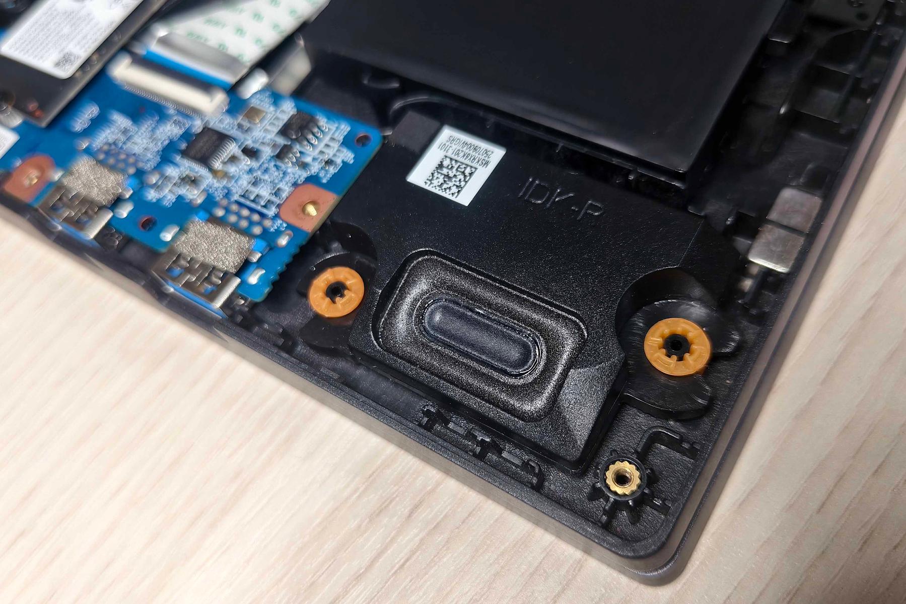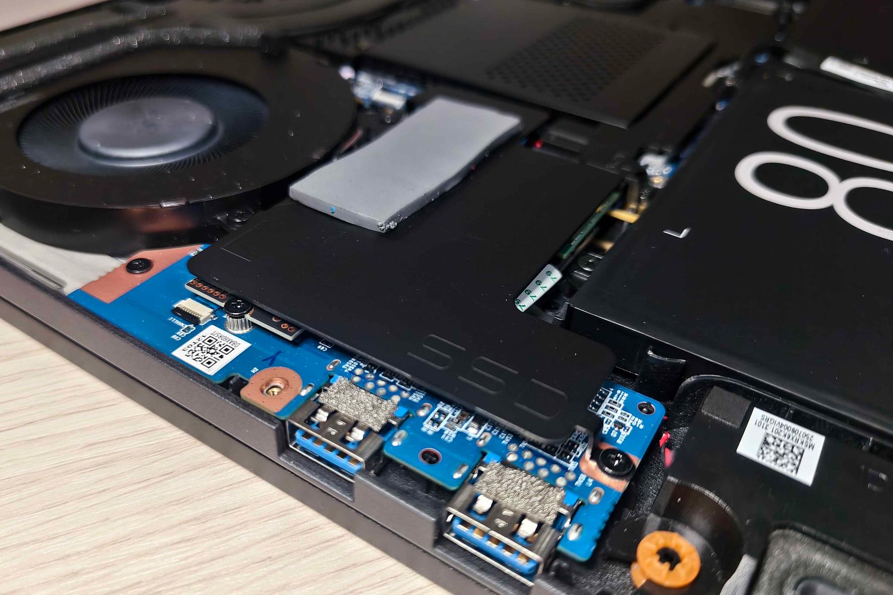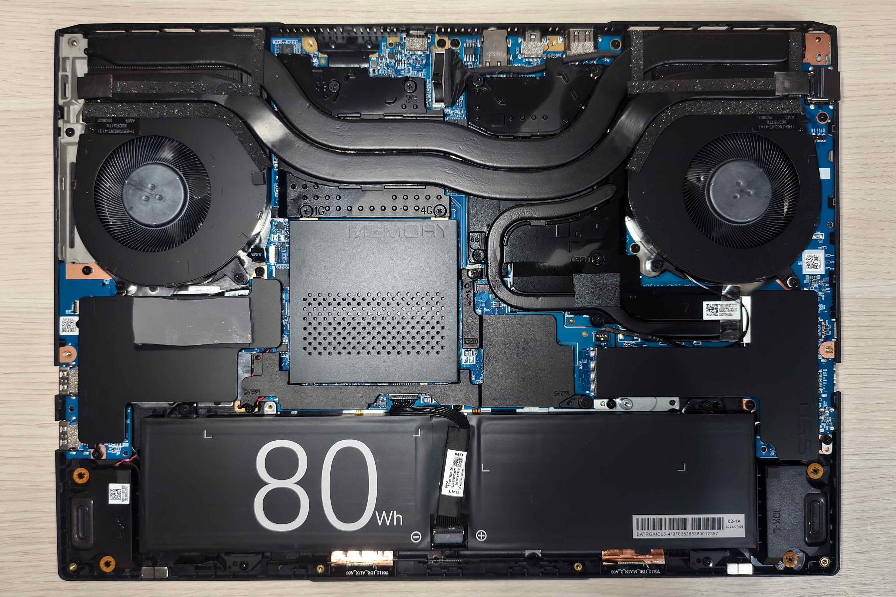 В передней части ноутбука расположилась батарея на 80 Вт·ч. Слева и справа от нее установлены динамики на мягком подвесе. Над левым находится пластина, под которой спрятались накопитель YMTC М.2 2280 NVMe PCIe 4.0 x4 на 1 ТБ и модуль беспроводной связи MediaTek MT7922.