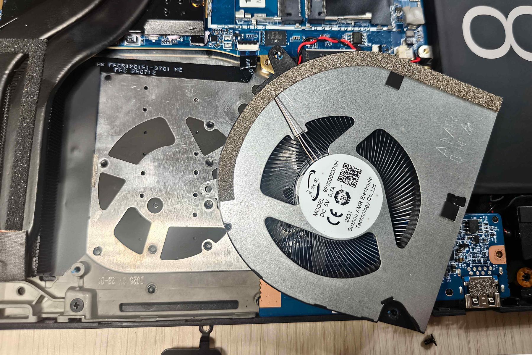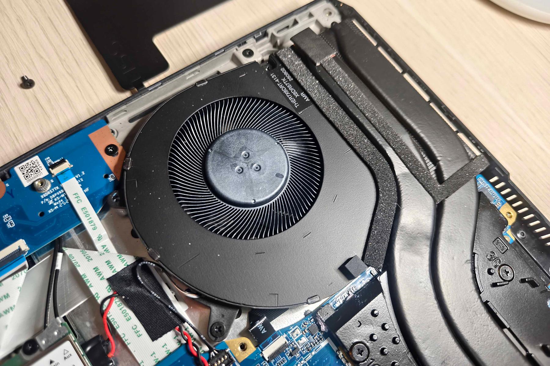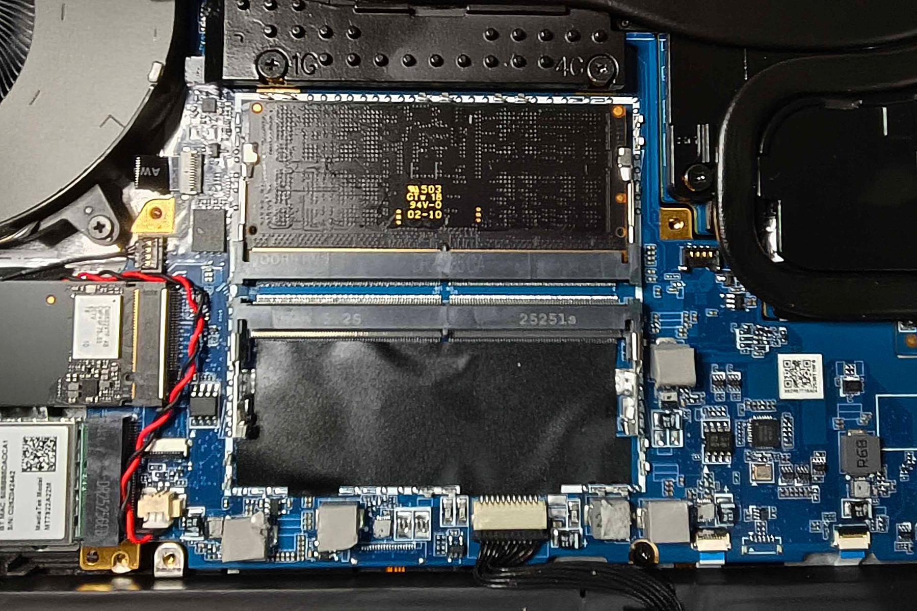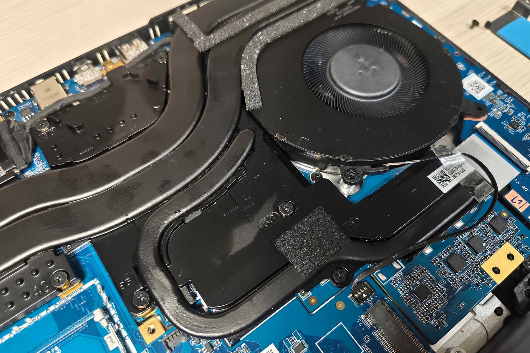 В передней части ноутбука расположилась батарея на 80 Вт·ч. Слева и справа от нее установлены динамики на мягком подвесе. Над левым находится пластина, под которой спрятались накопитель YMTC М.2 2280 NVMe PCIe 4.0 x4 на 1 ТБ и модуль беспроводной связи MediaTek MT7922.