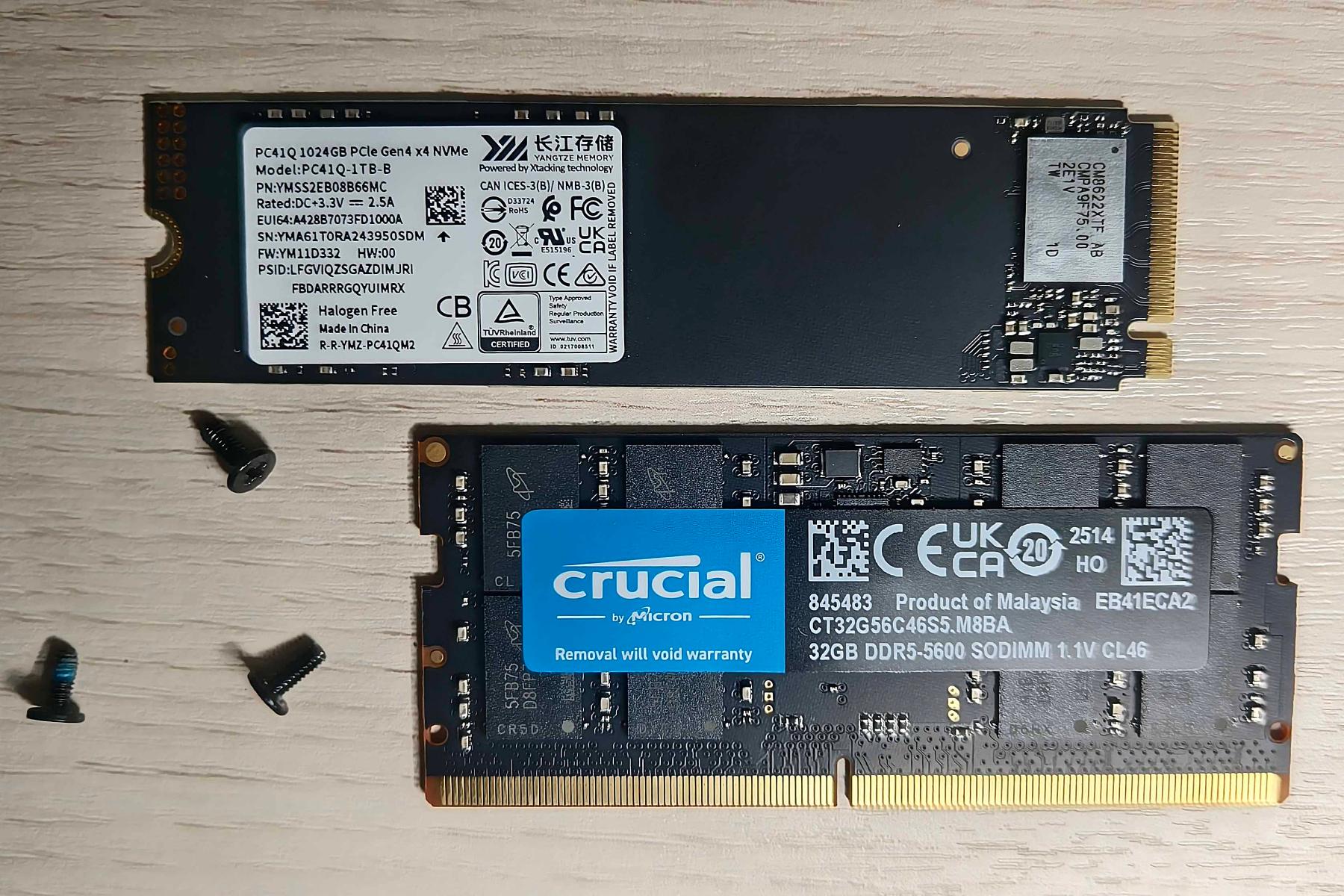 Центральную часть занимает квадратная крышка, под которой находятся два отдельных слота памяти. В верхний установлена планка Micron формата DDR5-5200 на 32 ГБ. Во второй слот было бы неплохо поставить еще одну такую же, поскольку система поддерживает до 64 ГБ и двухканальность.