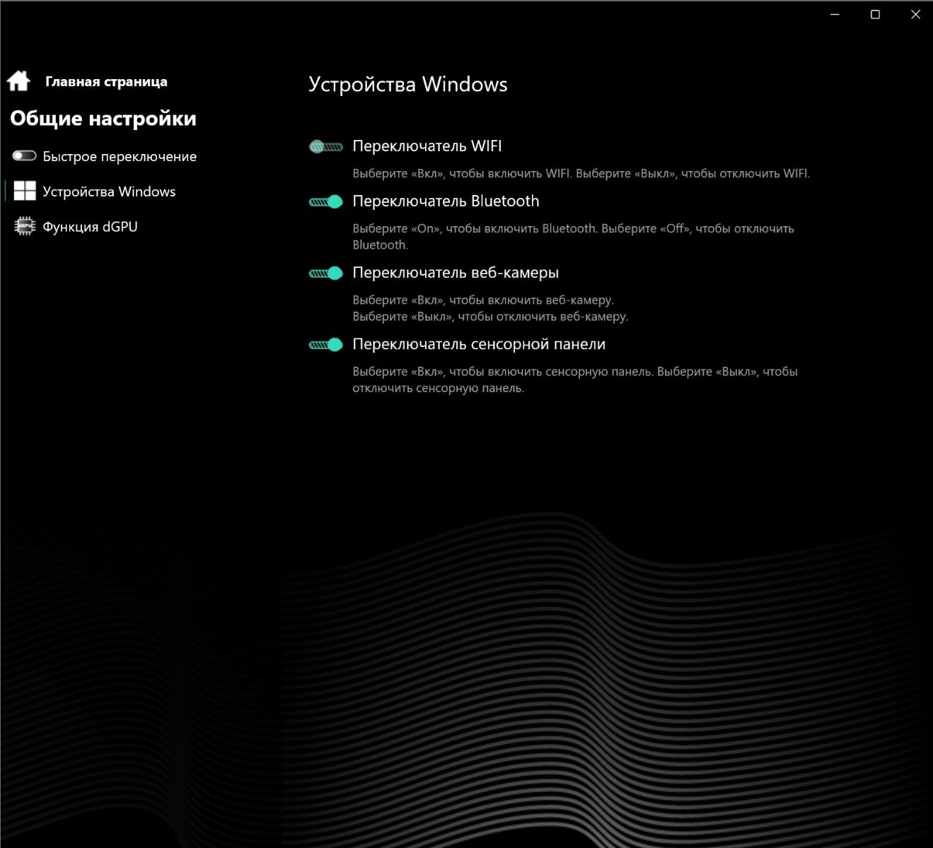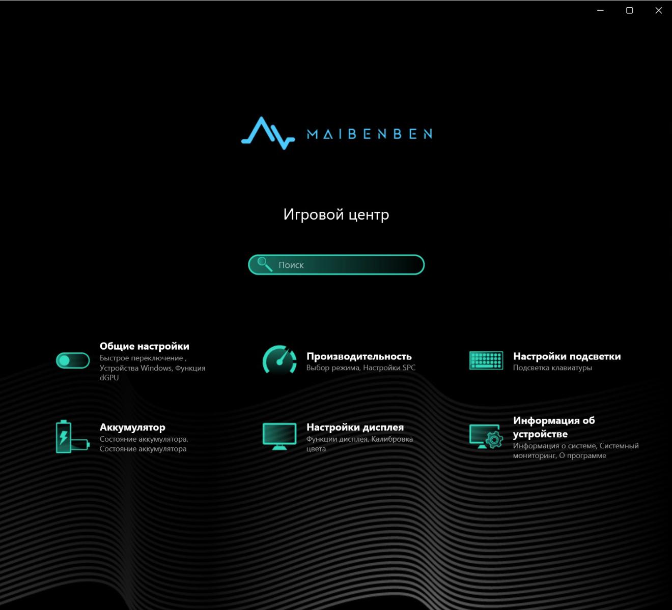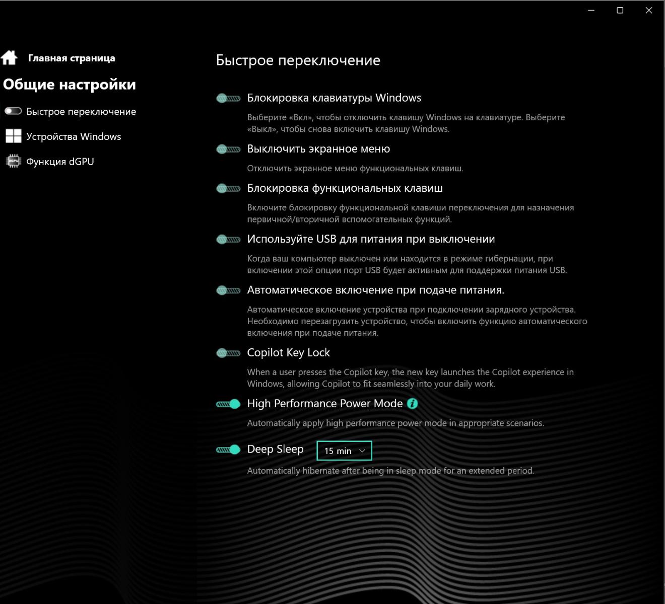 Фирменная утилита Maibenben позволяет отрегулировать ноутбук под себя. В «Общих настройках» можно выбрать время перехода в гибернацию, заблокировать некоторые клавиши, отключить подачу питания на USB-порты, включить автоматическое переключение режимов производительности, управлять Wi-Fi, Bluetooth, камерой, тачпадом, а также активировать автоматическое переключение между дискретным и интегрированным видеомодулями.