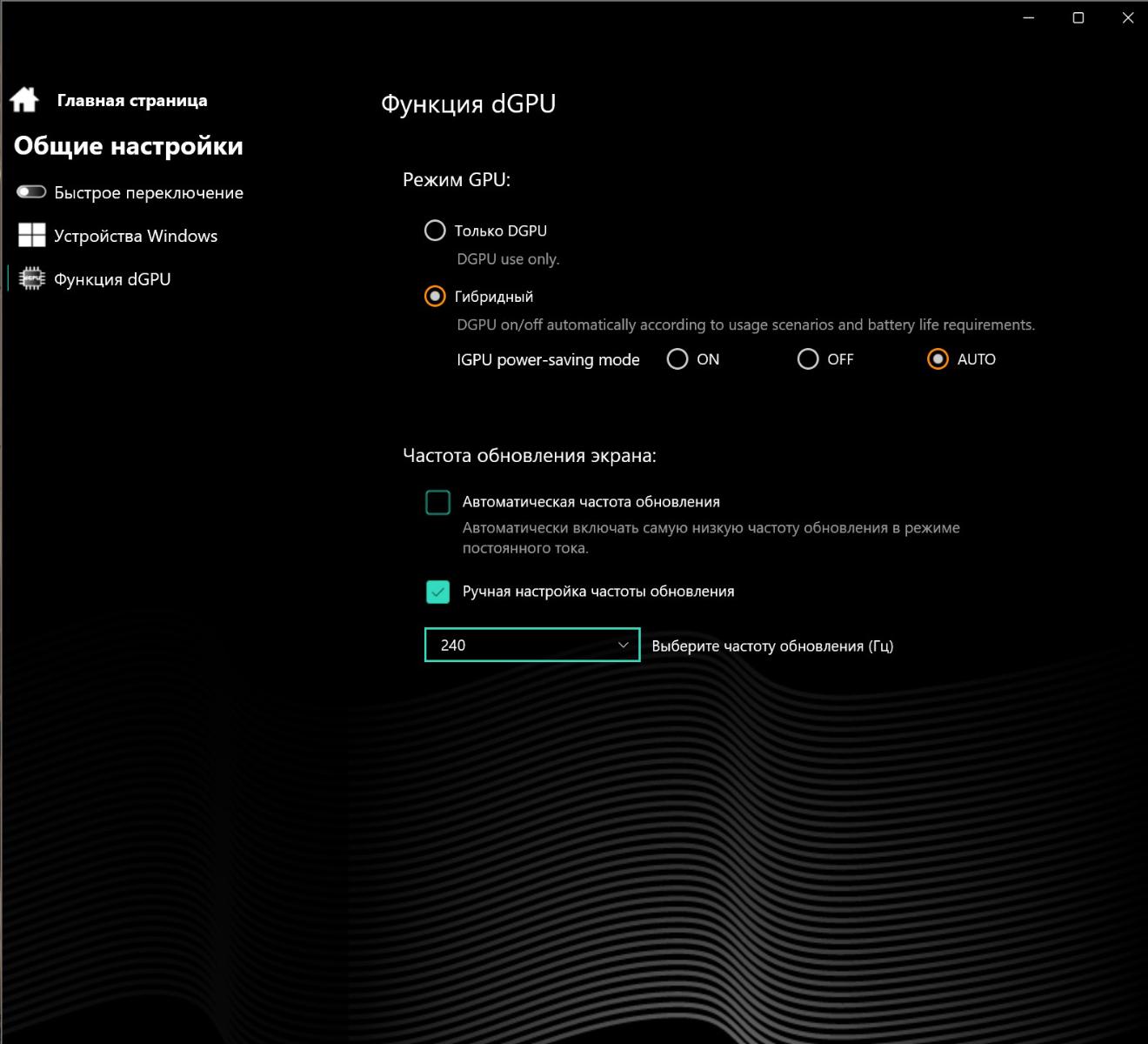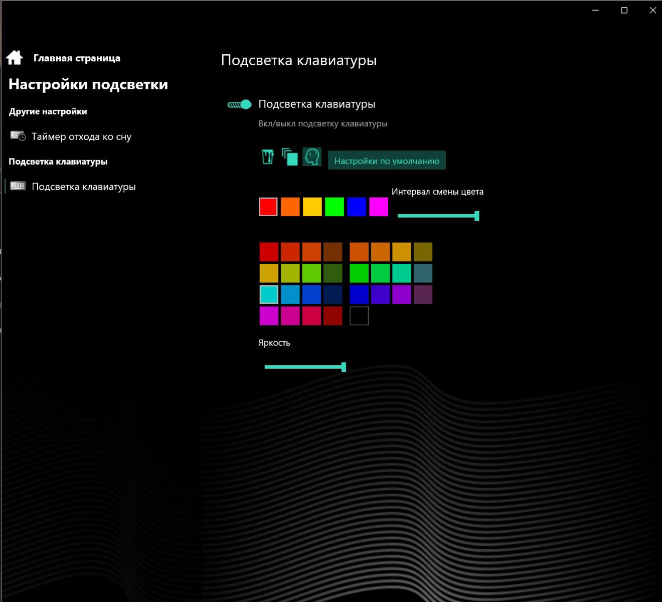В разделе «Производительность» доступна смена режимов мощности. В «Настройках подсветки» задается таймер отключения, яркость и тип (статичный или дыхание) иллюминации, а также выбирается порядок смены цветов. Вкладка «Аккумулятор» позволяет посмотреть состояние батареи и выбрать режим энергосбережения при автономной работе и с подключенным кабелем.