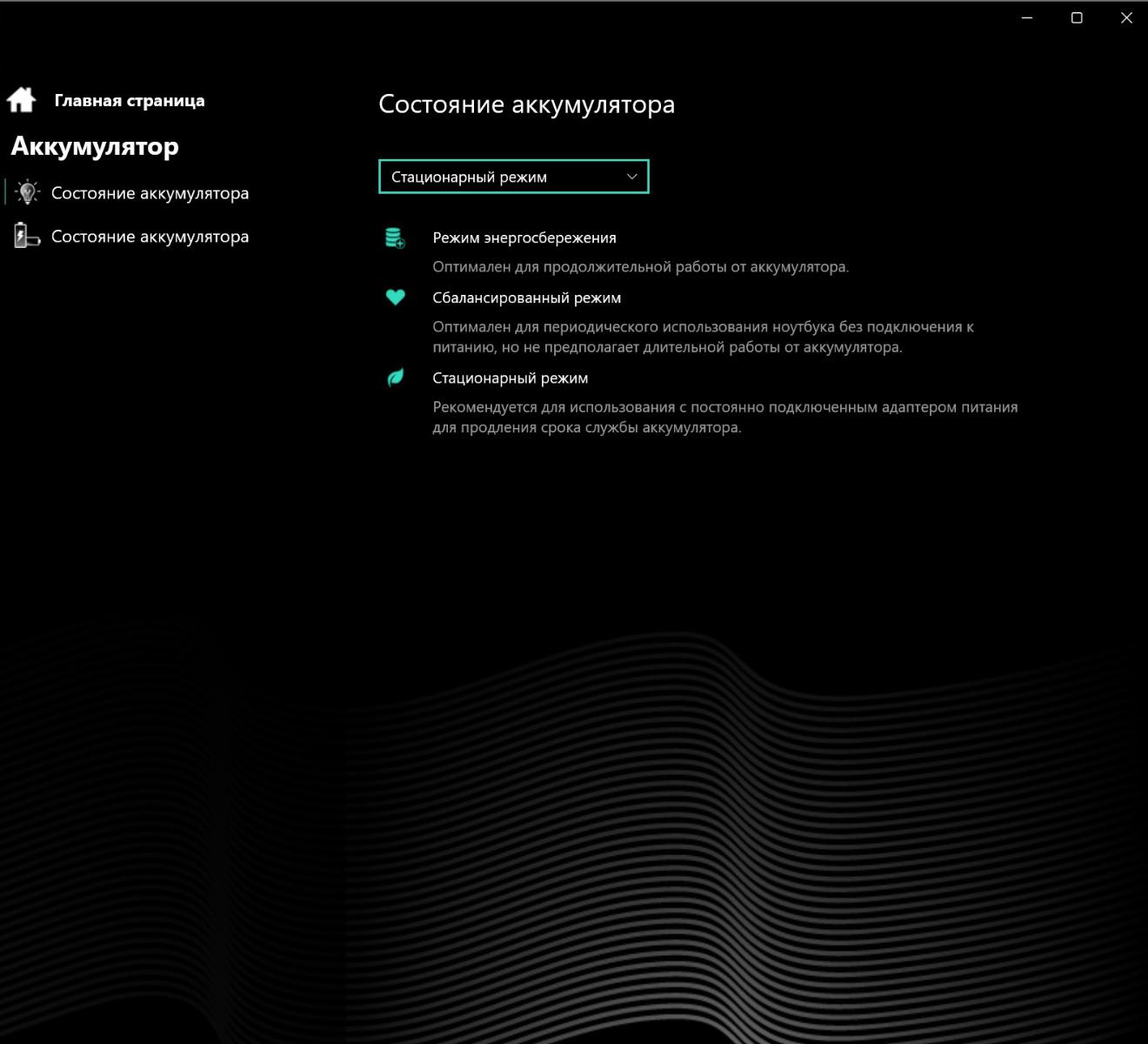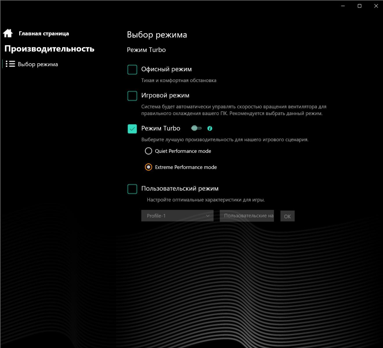 При автономном использовании ноутбука доступны только Office и Balance. Состояние запоминается: если был Turbo с проводом, а после отключение штекера переключили на Office, то с возвратом кабеля вновь активируется Turbo. Стоит также отметить, что при выборе режима энергосбережения в настройках, производительность снижается во всех режимах.