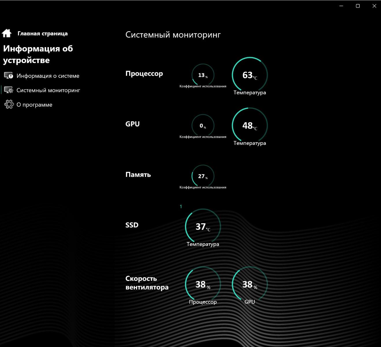 Контроллер в реальном времени анализирует температуру процессора и видеокарты, соответственно повышая или понижая частоту вращения кулеров. При бездействии процессор работает на частоте 2,7 ГГц, энергопотребление составляет 7 Вт, температура – 60°, при этом скорость кулеров 36%, и их не слышно (28 дБ).