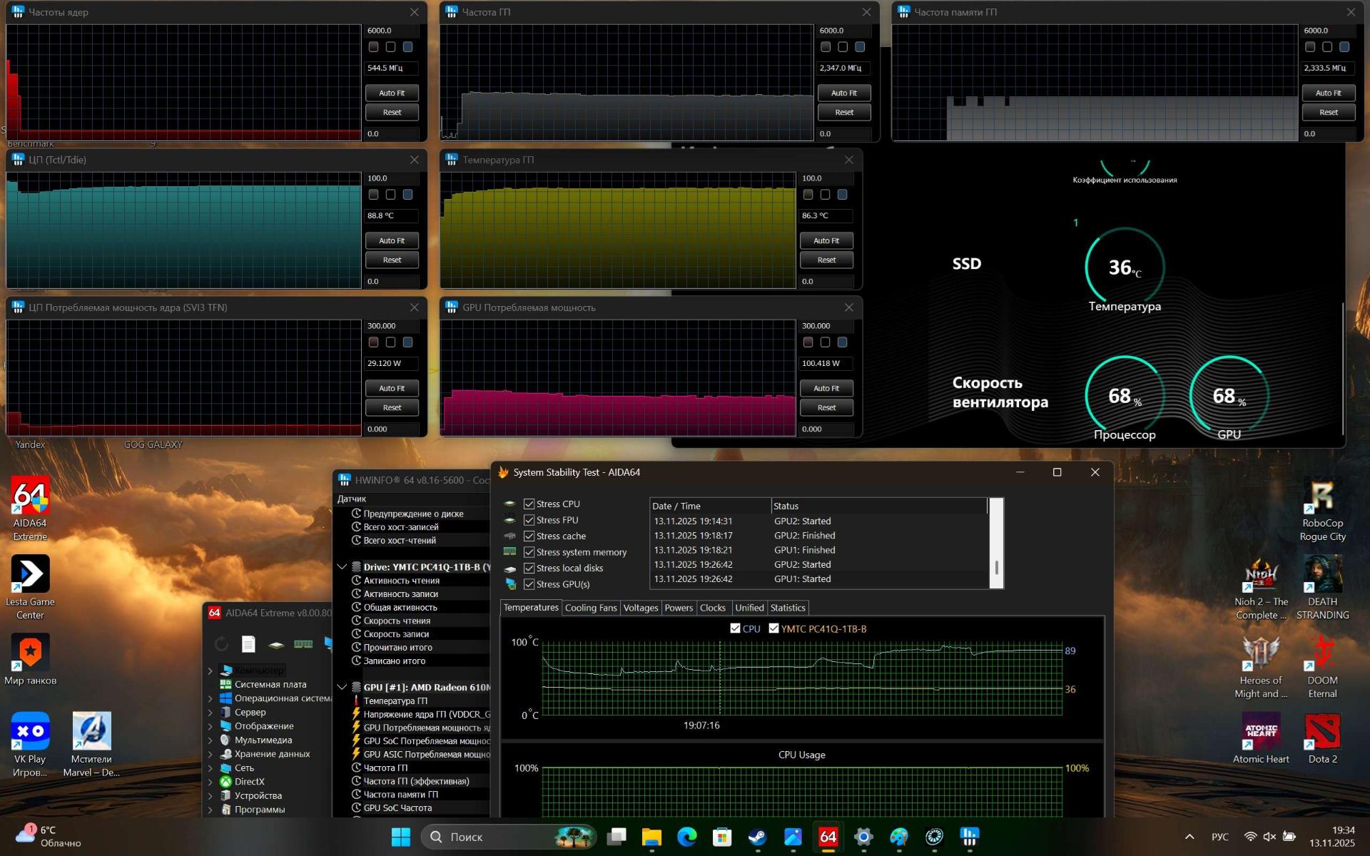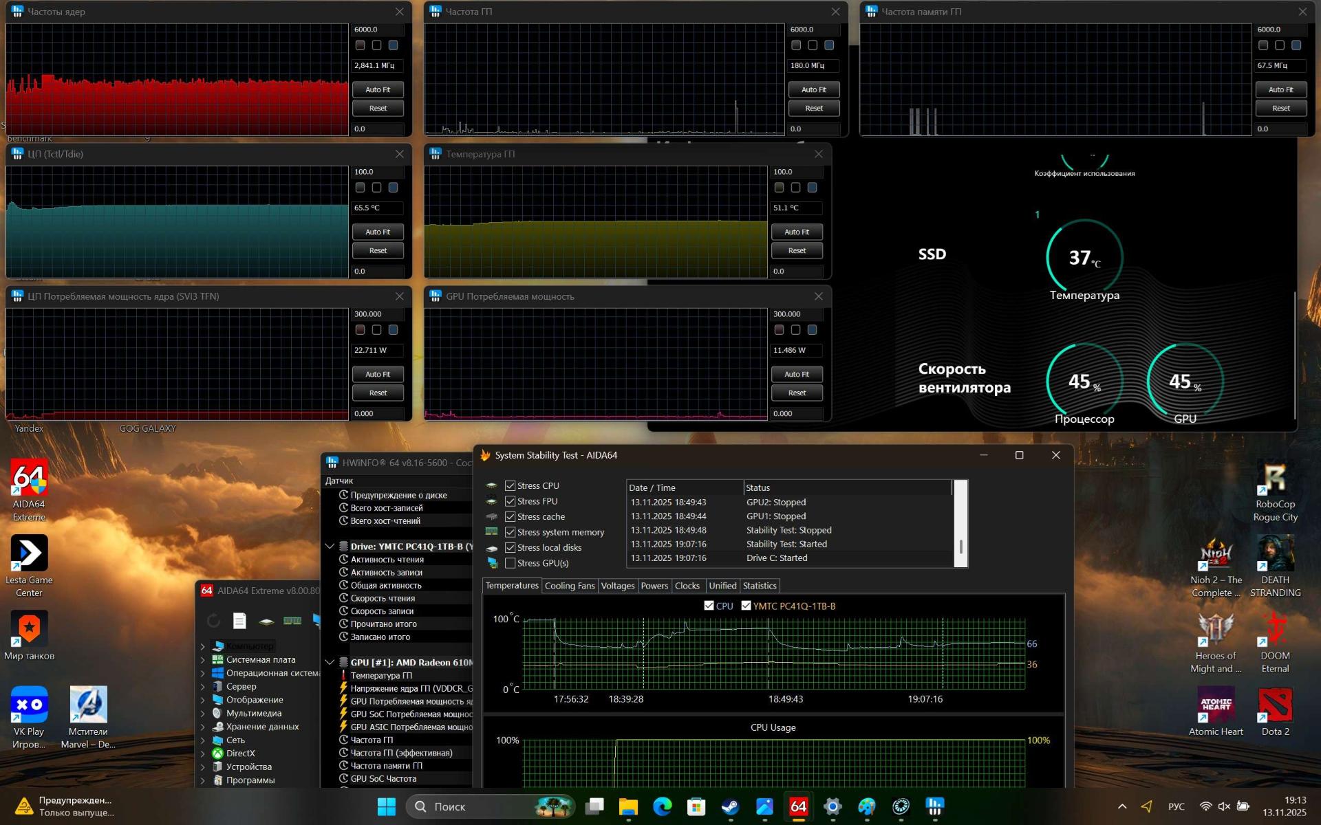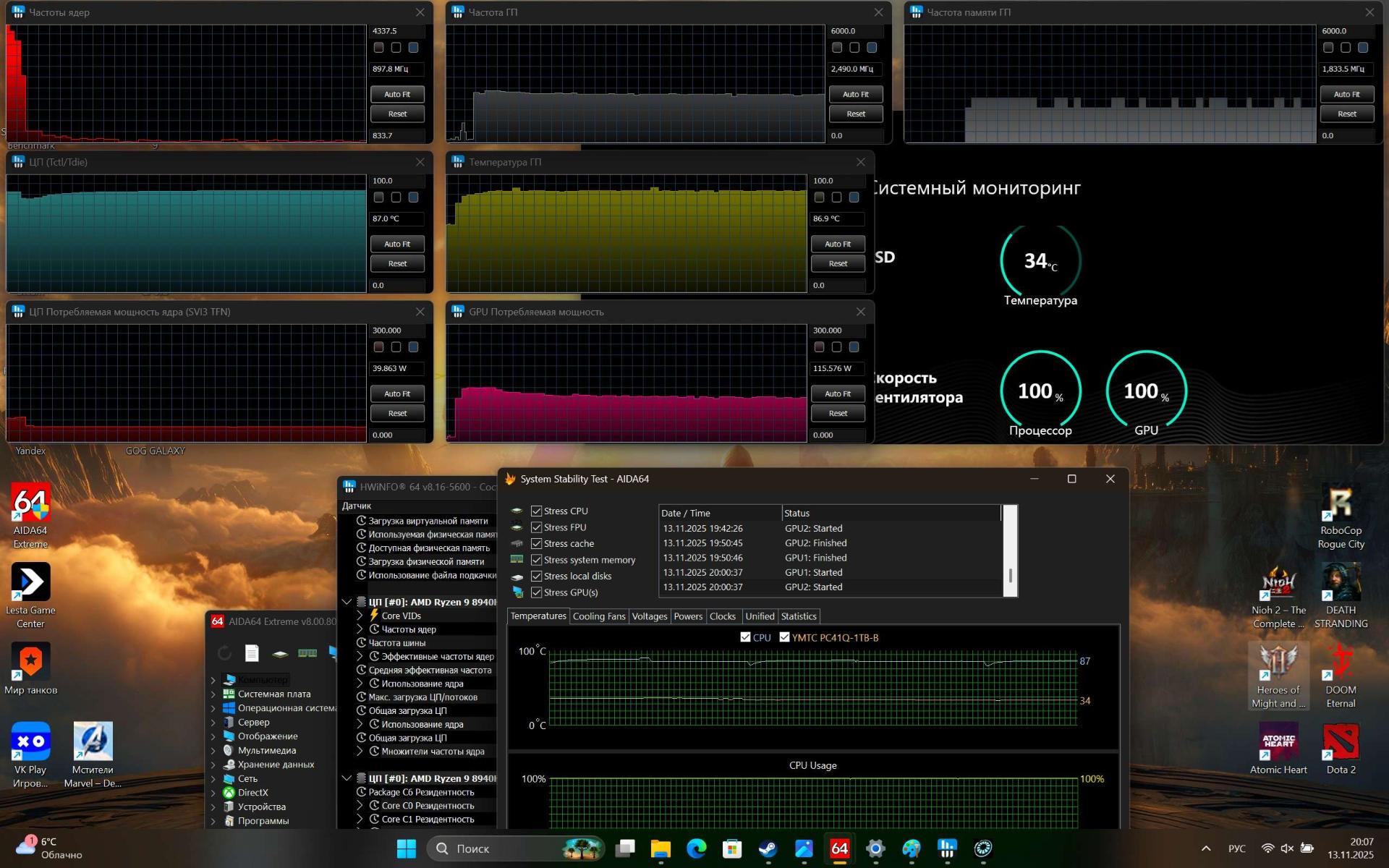 На Typhoon X16F установлена ОС Windows 11 Home Edition (24H2) и некоторое количество дополнительного софта – «Мой офис», Kaspersky, NVidea Control Panel и AMD Software. Программа Nahimic улучшает звучание местных динамиков, позволяя активировать такие опции, как объемный звук, автогромкость, повышенную четкость голоса, усиление нижних и высоких частот в различных сценариях использования – прослушивание музыки, просмотр фильмов, общение и гейминг.