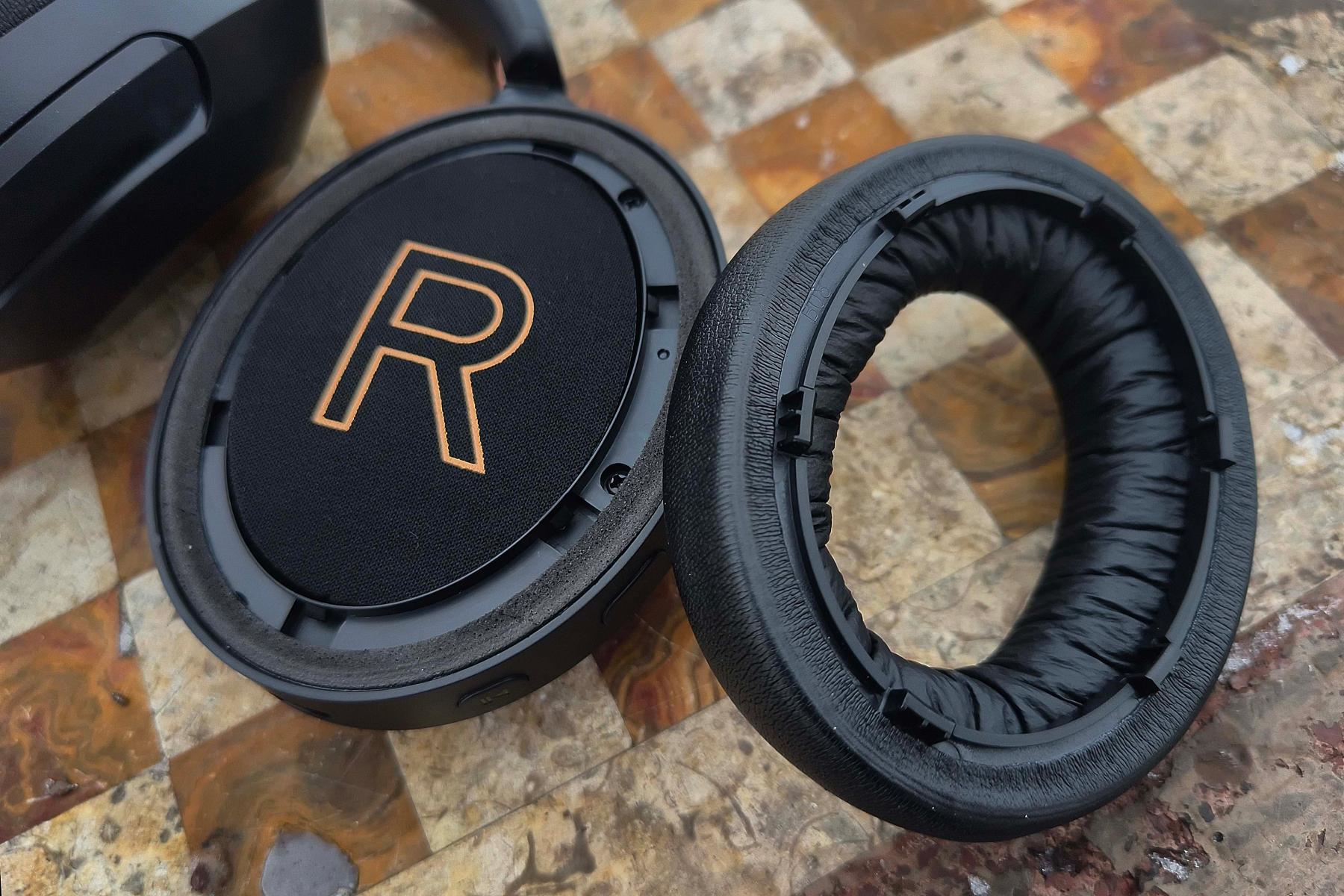 При помощи защелок на овальных чашках крепятся объемные амбушюры с эффектом памяти, обернутые в мягкую синтетическую кожу. Верхняя же часть обода обтянута тканью – нечасто можно встретить разные материалы в отделке. На внутренней стороне обода поместили мягкую подушечку, еще две с маркировкой R/L прикрывают динамики.