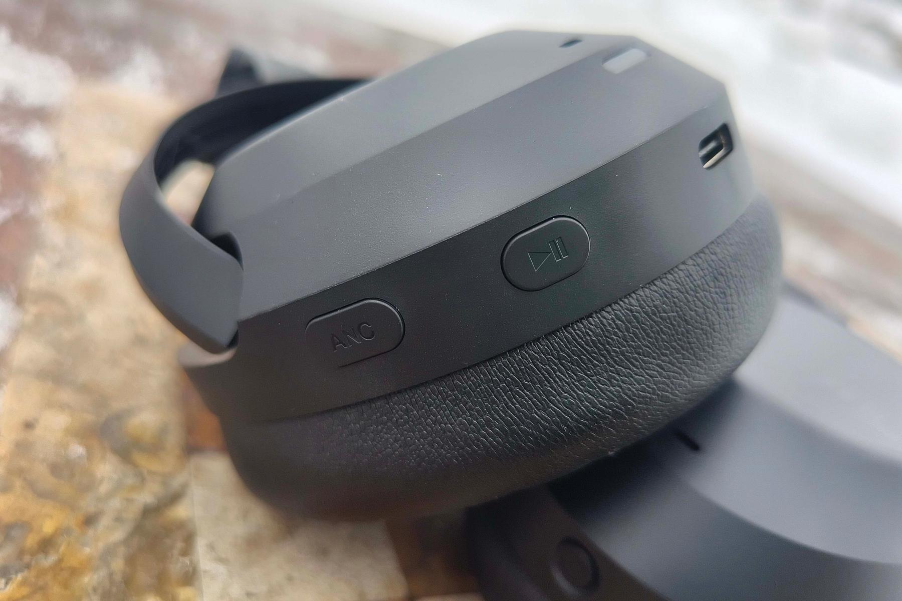Кнопки и порты вынесены на ободы обеих чашек. Слева располагаются клавиши переключения треков, плей/паузы и ANC, а также разъем Type-C и индикатор зарядки. Справа установлены слегка углубленная в корпус клавиша включения/сопряжения со светодиодом и роллер для изменения громкости.