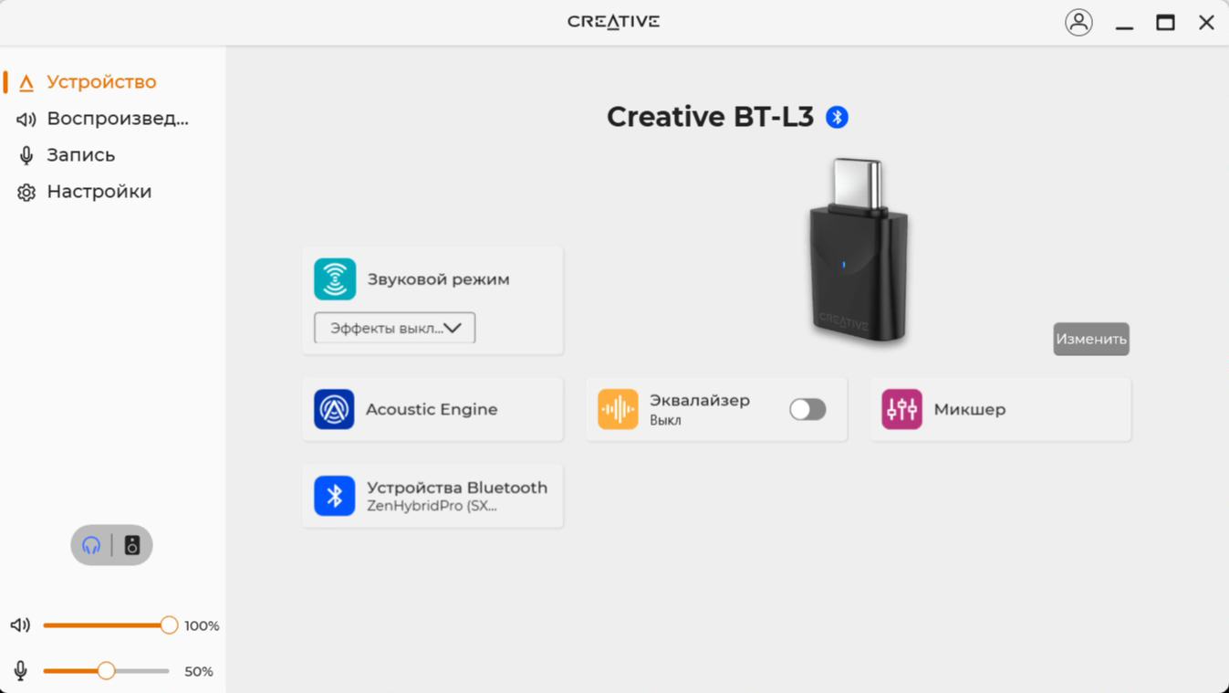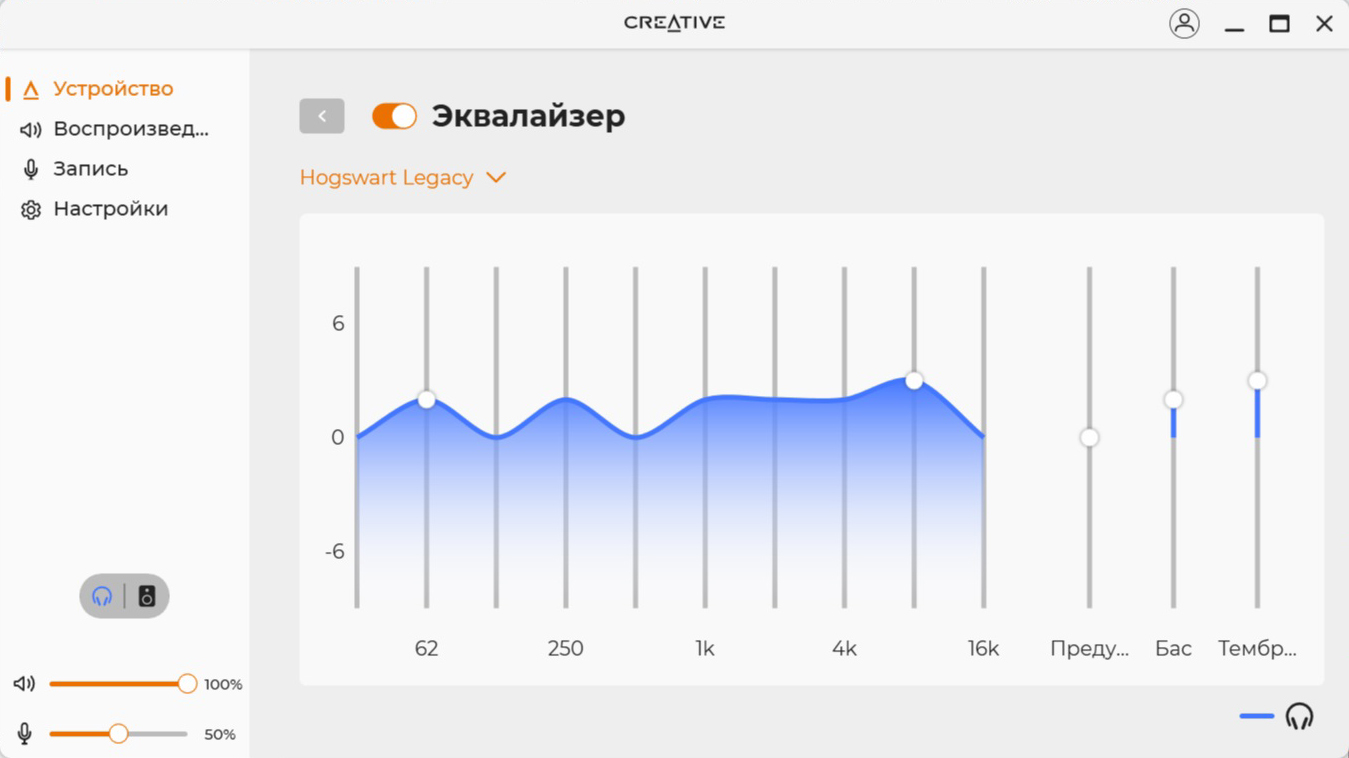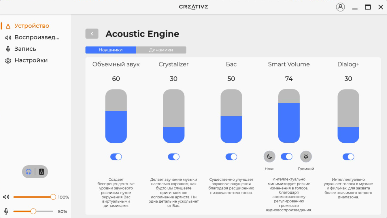 Акустическая сцена присутствует в полном объеме. Обволакивающие басы не слишком глубокие, поэтому не перекрывают другие участки. Средний диапазон напористый и детализированный, хорошо считывается вокал, а инструменты не перемешиваются. Верхний участок явно обрезан, но это делает звук не таким «колючим». С энергичными треками динамики справляются. В целом звучание неплохое, хотя для меня не идеальное – скорее всего, придется «поиграться» эквалайзером, чтобы получать кайф от любой музыки. А вот проблемы с приложением SXFI App расстроили – функция картирования головы Creative всегда положительно сказывалась на звучании. Запас по громкости приличный – редко приходится поднимать ползунок выше 40-50%.