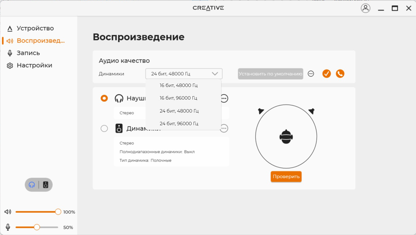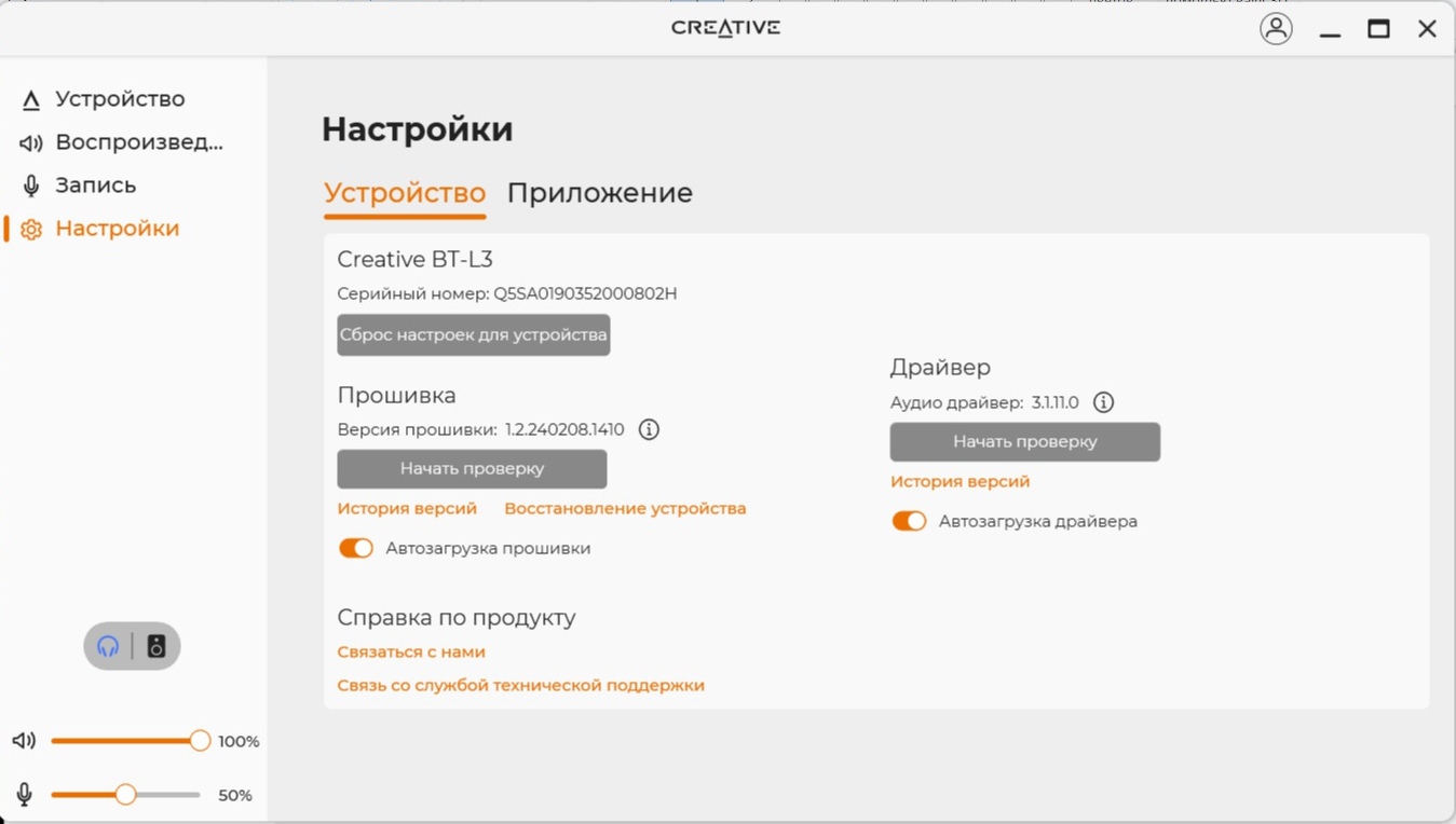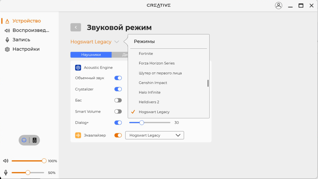 Акустическая сцена присутствует в полном объеме. Обволакивающие басы не слишком глубокие, поэтому не перекрывают другие участки. Средний диапазон напористый и детализированный, хорошо считывается вокал, а инструменты не перемешиваются. Верхний участок явно обрезан, но это делает звук не таким «колючим». С энергичными треками динамики справляются. В целом звучание неплохое, хотя для меня не идеальное – скорее всего, придется «поиграться» эквалайзером, чтобы получать кайф от любой музыки. А вот проблемы с приложением SXFI App расстроили – функция картирования головы Creative всегда положительно сказывалась на звучании. Запас по громкости приличный – редко приходится поднимать ползунок выше 40-50%.