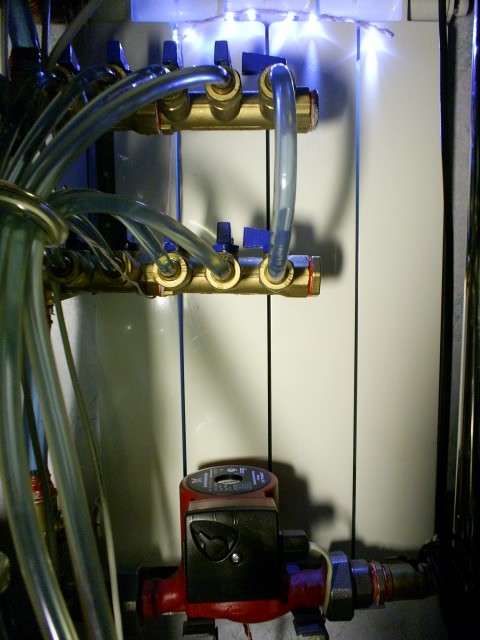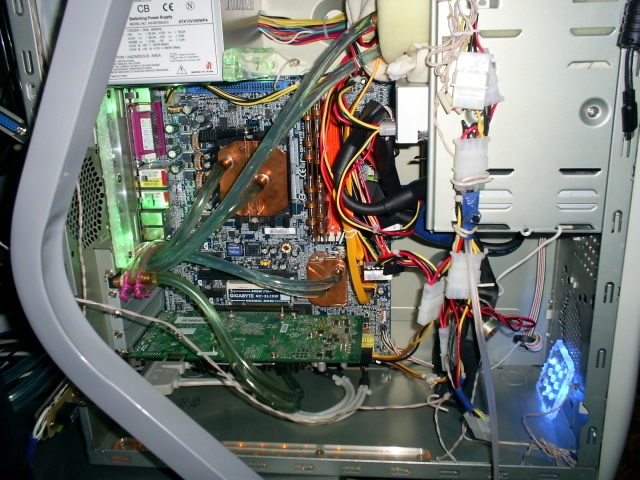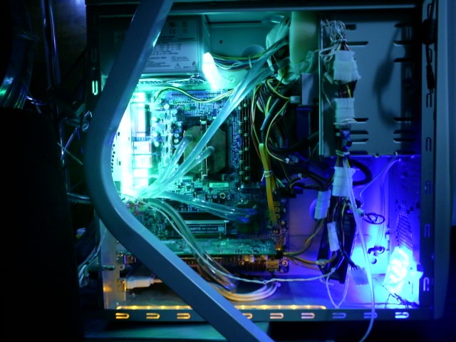 <br/><br/>Вид моего компьютера с самодельным водяным охлаждением процессора, чипсета, видеокарты, жесткого диска (в правом верхнем углу системника), охлаждение оперативки медными накладками из 1 мм медного листа (помогло немного поднять порог предельной частоты) и самодельной подсветкой на основе сверх ярких светодиодов.
