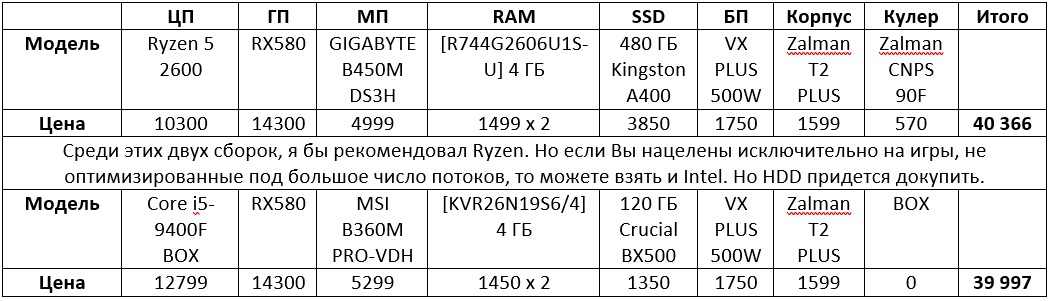 Как Вы могли заметить, на рынке компьютерного железа сейчас творится полнейший хаос. Ценообразование на отдельные позиции просто не поддается какому-либо логическому объяснению. Я постарался максимально объективно, без оглядки на каких-либо вендоров, а лишь исходя из цен и логики, подобрать для Вас наиболее выгодные и интересные комплектации. На мой взгляд, решения, основанные на процессорах intel, накладывают слишком много ограничений. Но, справедливости ради, в топовом геймерском железе у них нет конкурентов. Однако, накопить на Core i7 9700KF, и уж тем более на Core i7 9900KF это та ещё задача.
