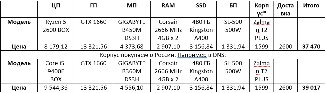 Как мы видим, при заказе из Германии, обе системы получаются значительно более производительными. Хоть с райзеном и получился небольшой перерасход, но зато у нас полноценный 6-ядерный, 12-поточный процессор. Проблему же с пространством предлагаю решить с получки, покупкой жесткого диска на 1 Тб. К примеру, Toshiba P300 [HDWD110UZSVA] за 2599 рублей в ДНС.