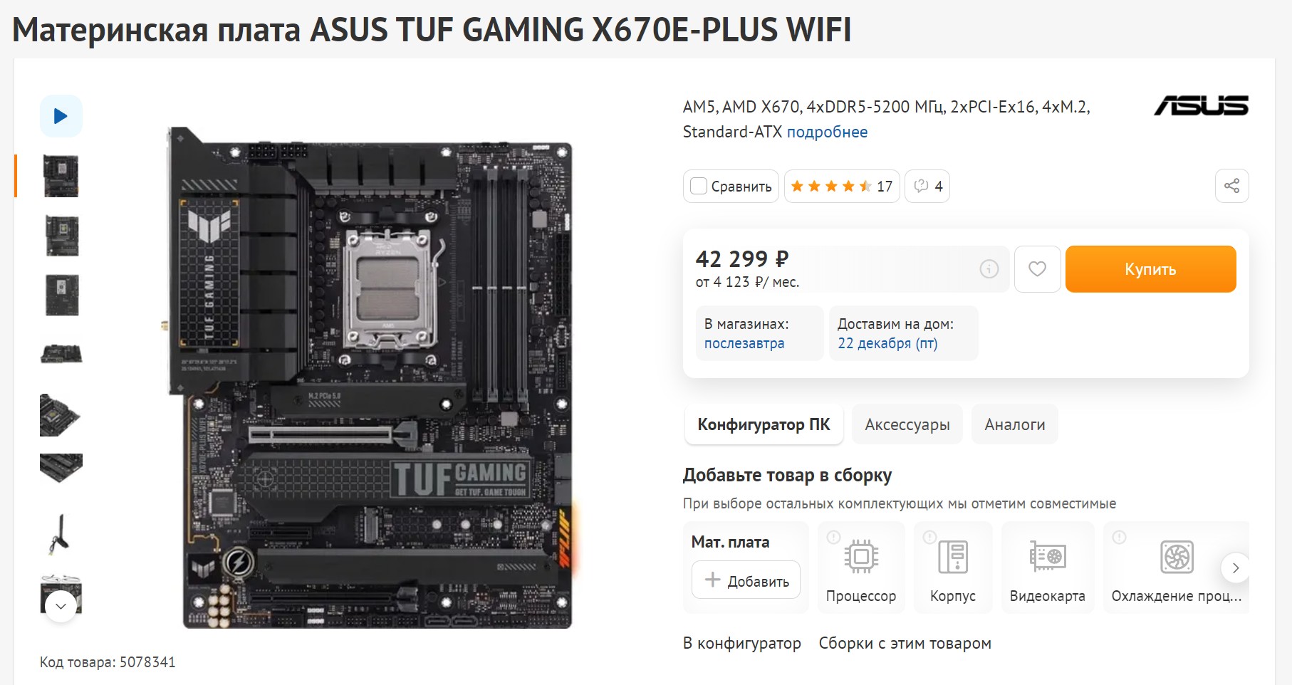 Вот, что я нашел для материнки - взял топовую модель от Asus в их линейке TUF Gaming. Здесь все круто - чипсет 670 с поддержкой PCI Express 5.0. Тут можешь засунуть до 192 гигов DDR5, аж 4 M.2 слота и столько же SATA портов. В комплекте еще Wi-Fi-антенна, которую можно прикрутить к задней панели. Там, кстати, куча интерфейсов, включая два Type-C порта и 2.5 Гбитный LAN. С охлаждением и питанием у них все в порядке, так что тут даже условного 7950Х можно попробовать запихнуть. На будущее - в самый раз.