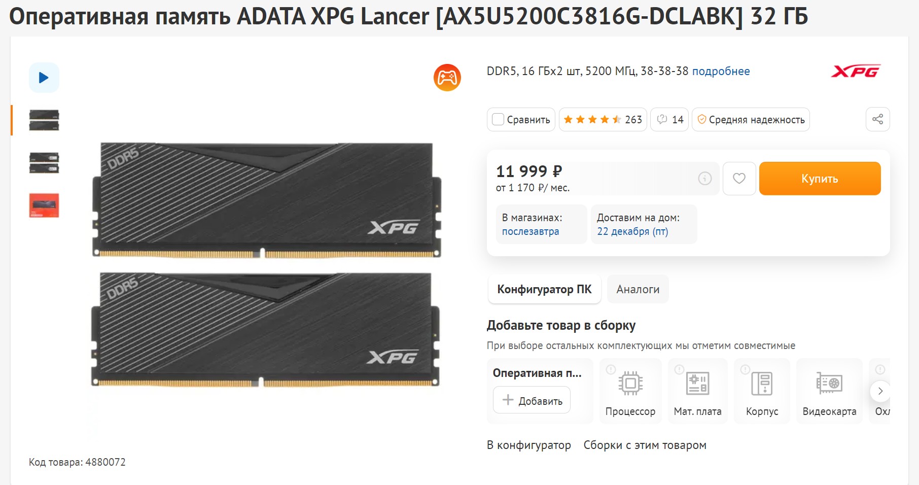Вот что я подобрал для оперативной памяти - выбрал уже отлаженный набор от ADATA, именно XPG Lancer. В комплекте два модуля DDR5 по 16 Гб каждый. Эта ОЗУ работает по вшитому XMP-профилю на 5200 МГц с приемлемыми таймингами 38-38-38, а их высота всего 40 мм. В дизайне они не выделываются, только аккуратные радиаторы. Цена за этот набор всего 12 тысяч рублей, что, согласись, для DDR5 памяти - довольно демократично.
