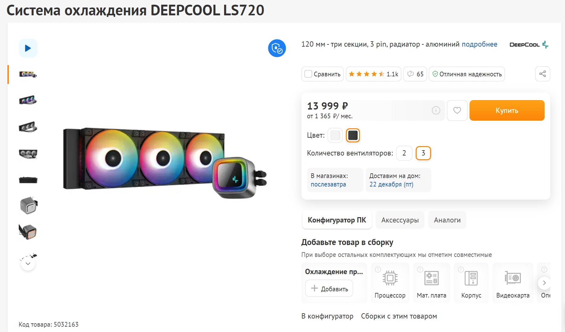Для поддержания адекватной температуры процессора я решил использовать топовую систему жидкостного охлаждения LS720 от Deepcool. Эта модель оснащена тремя секциями по 120 мм, поэтому при выборе корпуса важно учесть данную размерность. Устройство является относительно тихим, обеспечивая максимальный уровень шума на уровне 33 дБ. Среди интересных особенностей стоит выделить стильный дизайн помпы, который позволяет добавить собственный логотип на лицевой экран для персонализации. Это, пожалуй, небольшой акцент, но всегда приятный. Данная модель справится с охлаждением практически любых процессоров от Intel и AMD, включая 7800X3D. Поэтому, на мой взгляд, её стоимость в 14 тысяч рублей полностью оправдана.