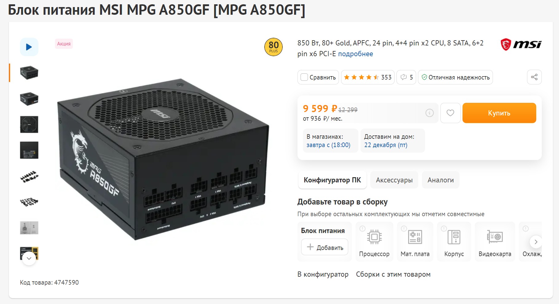 Блок питания – это один из ключевых компонентов любого компьютера. Неудачный выбор может повлечь за собой проблемы со всей системой. Я сразу исключаю все модели без сертификата 80+ и от неизвестных брендов, поскольку в данном случае экономия явно неуместна. Учитывая мощность моей системы и возможность разгона, я решил установить блок питания на 850 Вт, именно такой и был выбран. В итоге, в моей конфигурации будет использоваться блок питания от MSI с сертификатом 80+ Gold и современной модульной конструкцией. Вся заявленная номинальная мощность 850 Вт направлена на линию +12 В. Этого будет более чем достаточно для стандартных условий использования и разгона. Стоимость такой модели составляет около 10 тысяч рублей.