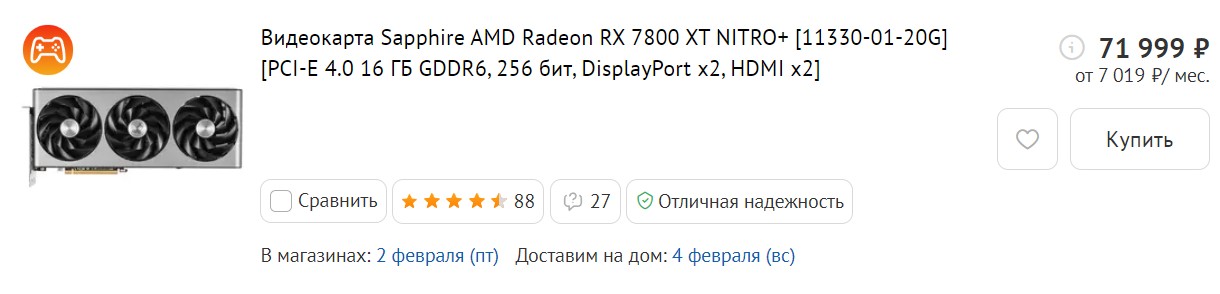 И третье, по энергоэффективности. TDP 220 Вт против 263 у конкурента. RTX 4070 Super легче в выборе блока питания. В магазине DNS, Palit GeForce RTX 4070 SUPER Dual стоит 73 тысячи рублей, где система охлаждения оставляет желать лучшего. Поэтому рекомендую искать более выгодные предложения, например, в магазине Ozon Казахстан, где эта модель стоит дешевле и доступна в более "жирном" исполнении за 66490 рублей с гарантией. Это нам понадобится, чтобы через 2-3 года продать эту видеокарту на вторичном рынке за хороший прайс, ведь с хорошим охлаждением вы сможете добавить к стоимости еще несколько тысяч рублей. Но если вы решите купить видеокарту от AMD, такую как 7800 XT, то не стоит переплачивать за охлаждение. На вторичке вам будет её довольно тяжело продать, какое бы охлаждение ни было, разве что за символическую цену. Поэтому с этой видеокартой вы останетесь надолго. Просто ищите самую дешёвую, и с гарантией. RTX 4070 Super - отличный выбор для создания мощной сборки под 2К гейминг без компромиссов.