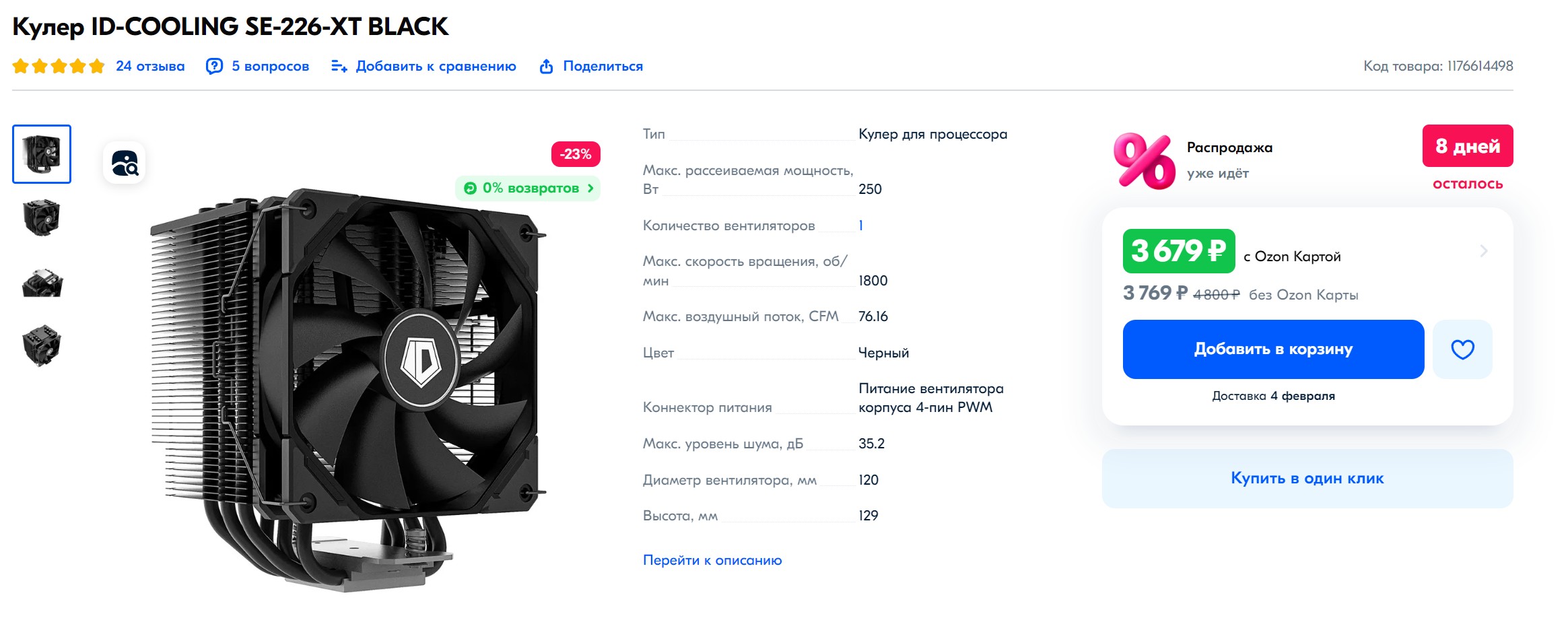 Мной была выбрана модель ID-COOLING SE-226-XT BLACK. Заявленная рассеиваемая мощность в 250 Вт выглядит немного завышенной, но даже с учетом возможной погрешности, этот кулер справится с задачей на все 100%. Он оснащен двумя вентиляторами, и хотя уровень шума может достигать 35 дБ, что может не понравиться некоторым пользователям, цена в районе 4 тысяч рублей делает его очень привлекательным вариантом.