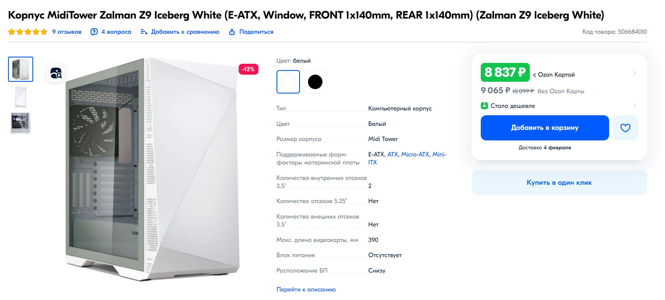 Пришло время рассмотреть последний, но не менее важный компонент моей сборки — корпус. В этом вопросе я остановил свой выбор на стильной модели Z9 Iceberg от Zalman. Этот корпус доступен в двух цветовых вариантах: классическом черном и элегантном белом. Его главная особенность заключается в просторном внутреннем пространстве, несмотря на форм-фактор мид-тауэр. Здесь у вас есть возможность установки до 6 вентиляторов размером 140 мм и даже 2 вентиляторов размером 200 мм. Кроме того, корпус поддерживает различные конфигурации водяных систем. Одной из приятных особенностей является наличие порта Type-C на верхней крышке, что делает его более актуальным в контексте современных устройств. Блок питания устанавливается в нижней части, обеспечивая удобство монтажа и хороший поток воздуха. Стоит отметить, что стильный дизайн этого корпуса, его функциональность и хорошие возможности по вентиляции делают его привлекательным выбором для продвинутых сборок. Весь этот комфорт и стиль вы можете приобрести за около 9 тысяч рублей.