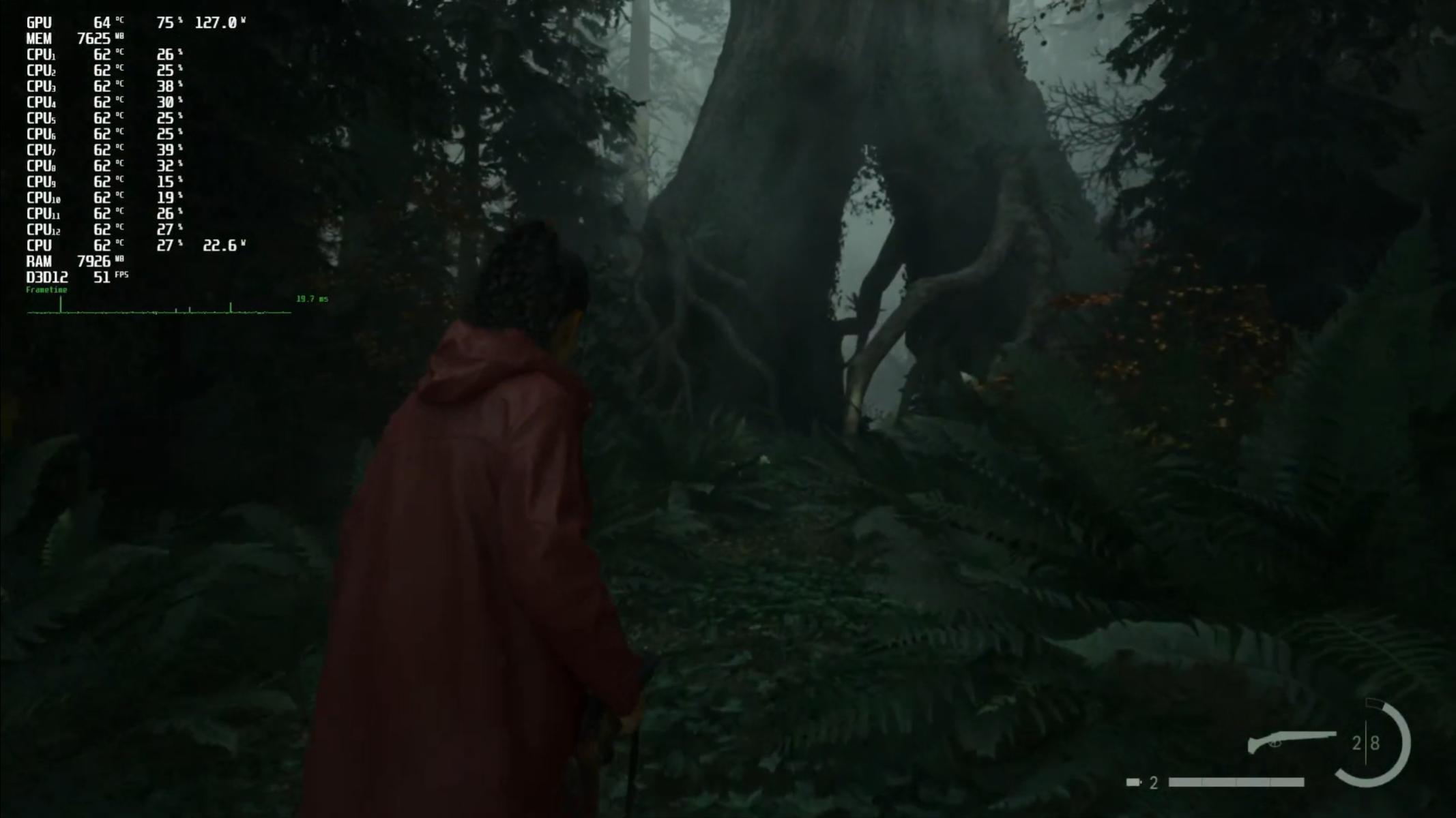 Переходим к крупным проектам. Первая игра — Alan Wake 2. Настройки графики средние. FSR качество. В 1440p от 40 до 55 кадров в секунду.