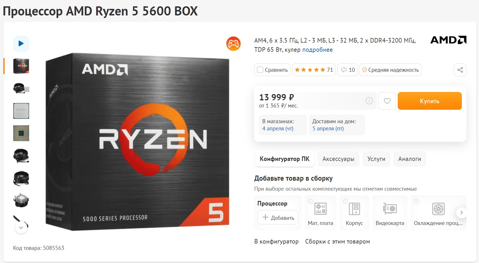 Какой процессор лучший в этом бюджете? Конечно же, Ryzen 5 5600X. И сегодня будет такой процессор, но без приставки X. Итак, встречайте лучший процессор от лучшей компании по производству процессоров AMD Ryzen 5 5600. Версия бокс, поэтому будет на пару тысяч дороже OEM-версии. По характеристикам тут 6 ядер и 12 потоков с частотой от 3,5 до 4,4 ГГц. 32 Мбайт L3 кэша, поддержка PCIe 4.0. Короче, это лучший процессор за свои деньги.